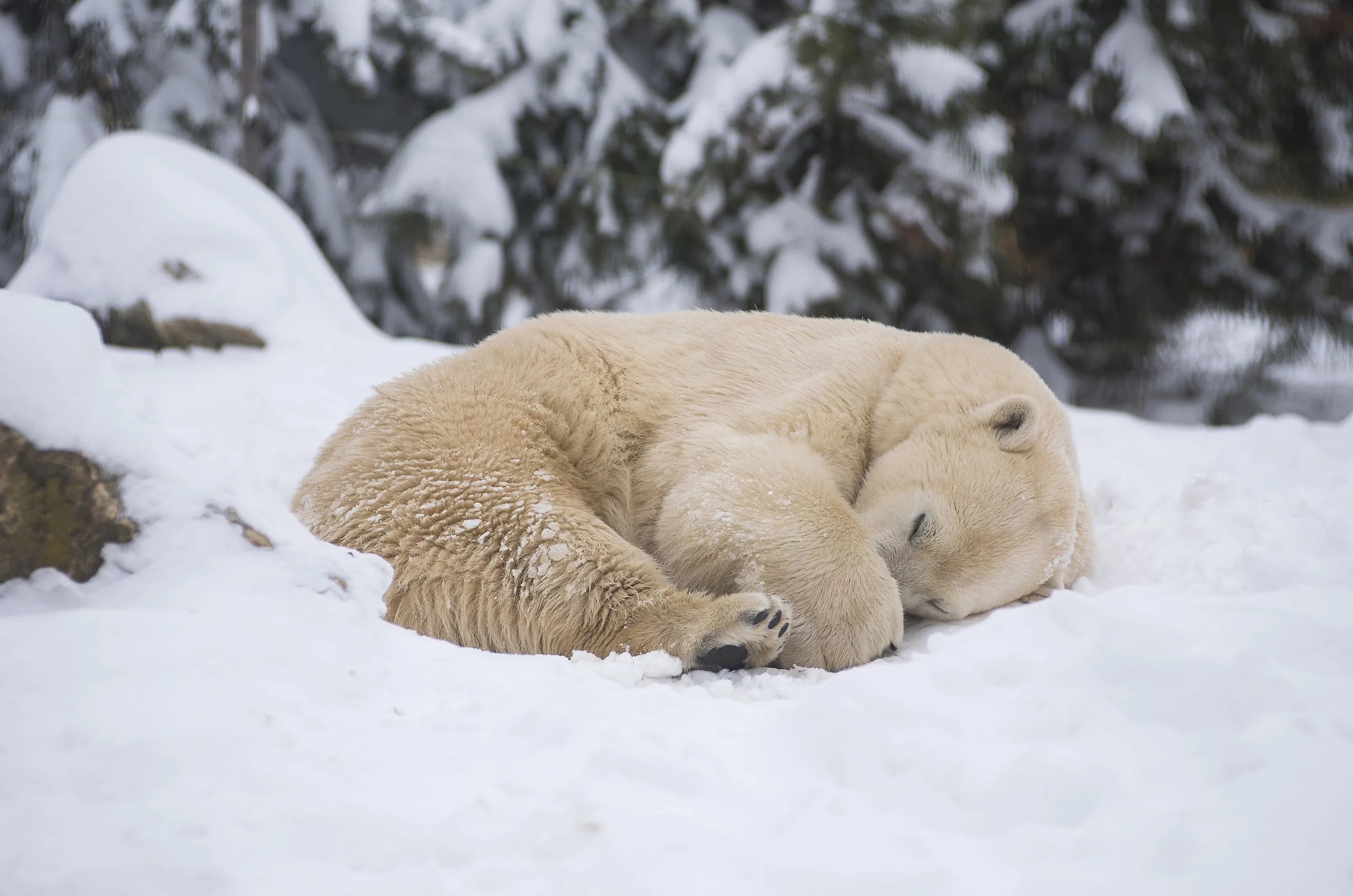 A polar bear curls up in the fresh snow in its enclosure in Sosto Zoo in Nyiregyhaza, Hungary, Sunday, March 18, 2018. (Photo by Attila Balazs/MTI via AP Photo)