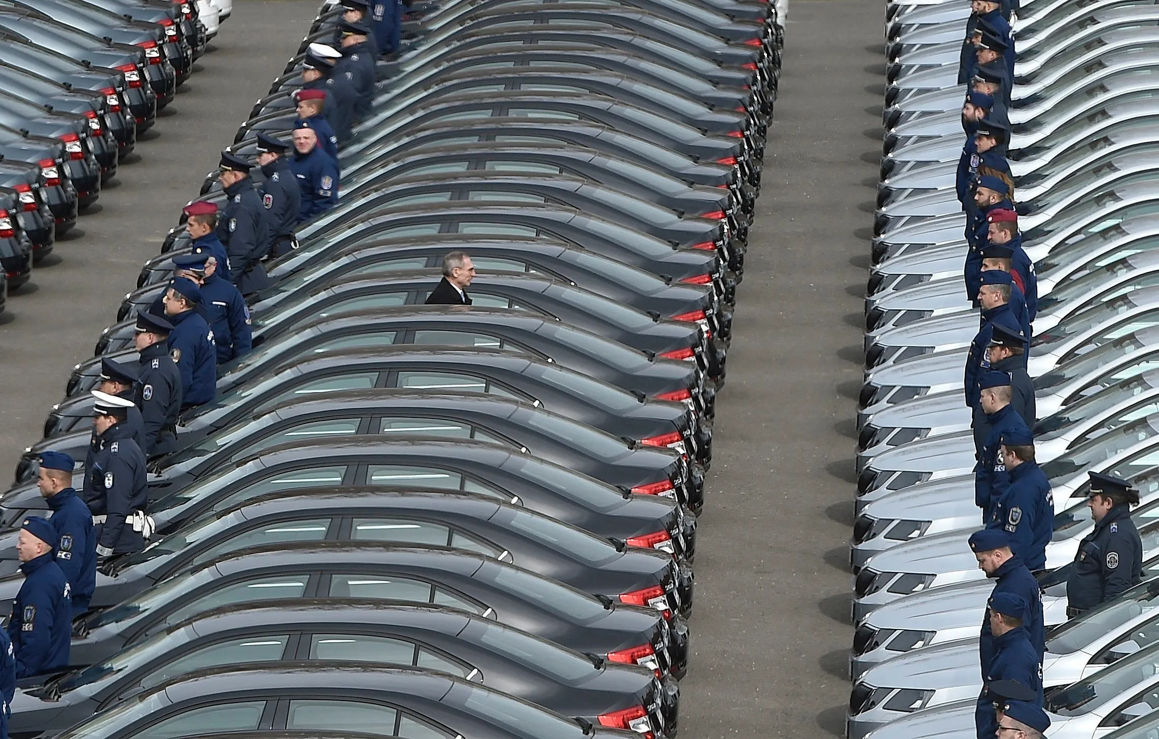 Hungarian Minister of Interior Sandor Pinter (C) passes between rows of new patrol cars of the Hungarian police force, at the yard of the operational police headquarters during the official handover ceremony in Budapest, Hungary, 23 March 2018. The police department acquired a total of 570 vehicles. Pinter pointed out in his inauguration speech that the number of criminal offences have decreased from 430 thousand in 2010 to 215 thousand in 2017 in the country. (Photo by Zoltan Mathe/EPA/EFE)
