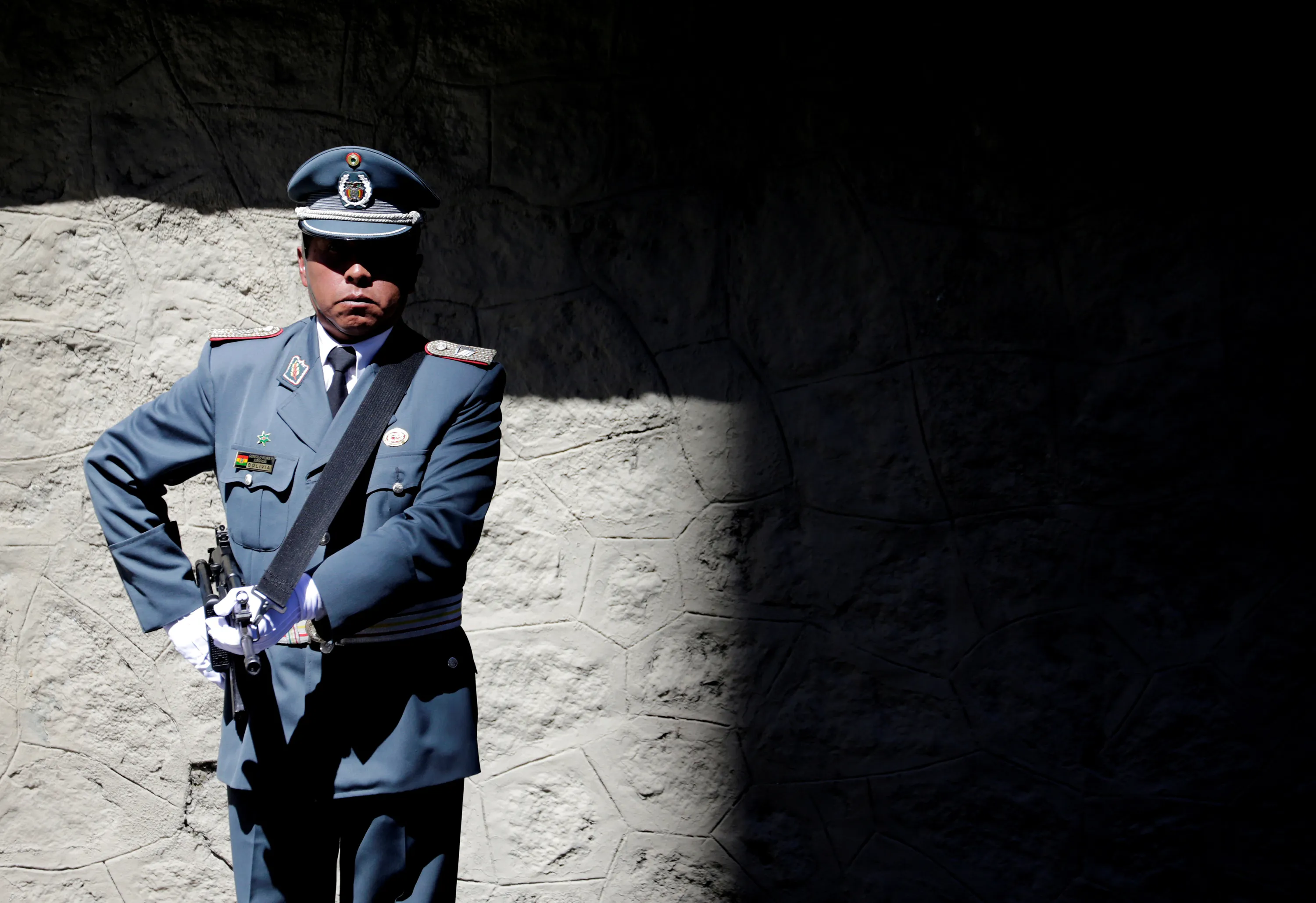 A military officer stands guard during the Sea Day commemorations at the Eduardo Avaroa square in La Paz, Bolivia March 23, 2018. (Photo by David Mercado/Reuters)