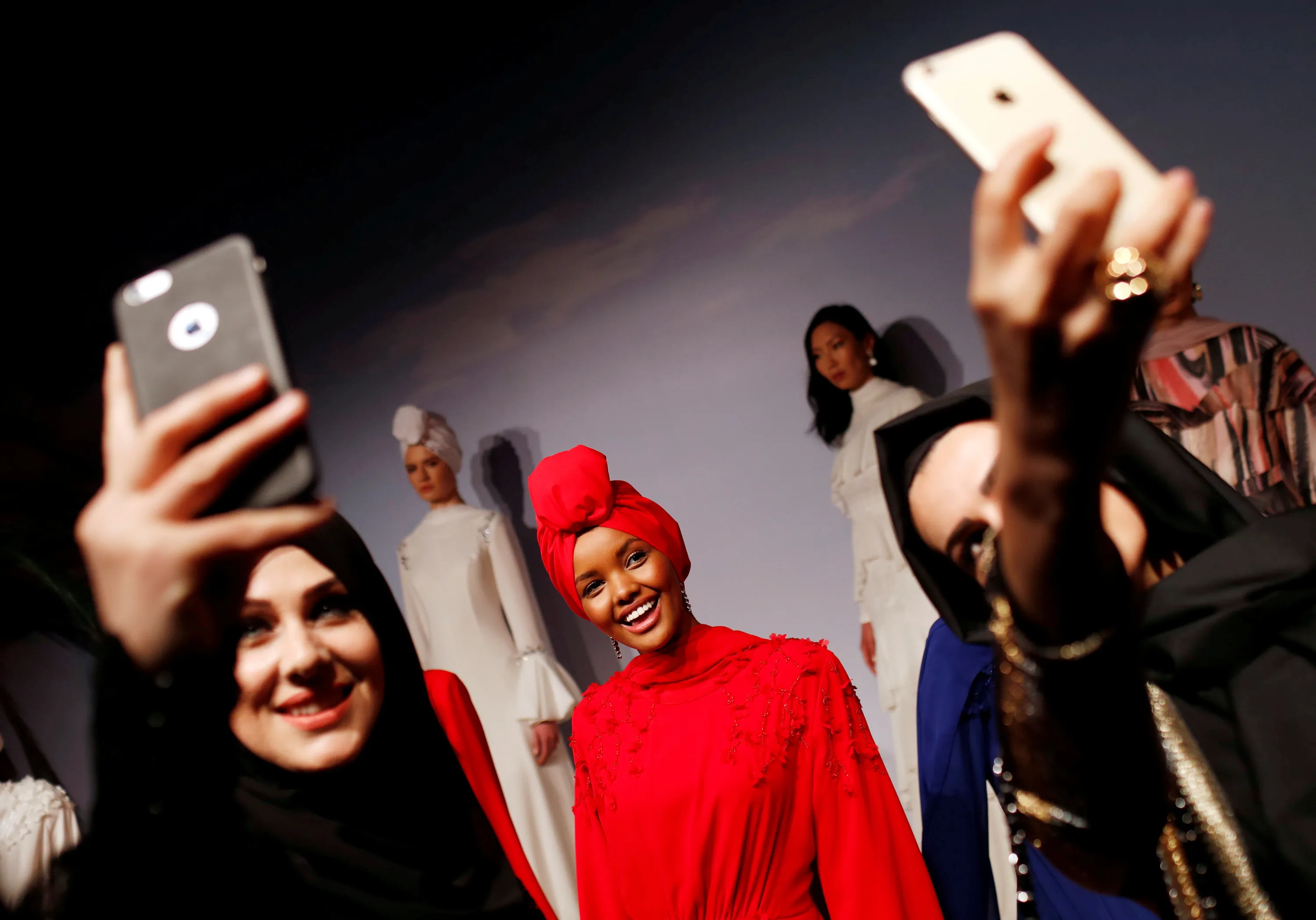 Women take selfies with Halima Aden, a hijab wearing model from the U.S., as she presents a creation by Turkish designer Rasit Bagzibagli for Modanisa during a modest fashion show in Istanbul, Turkey March 26, 2018. (Photo by Murad Sezer/Reuters)