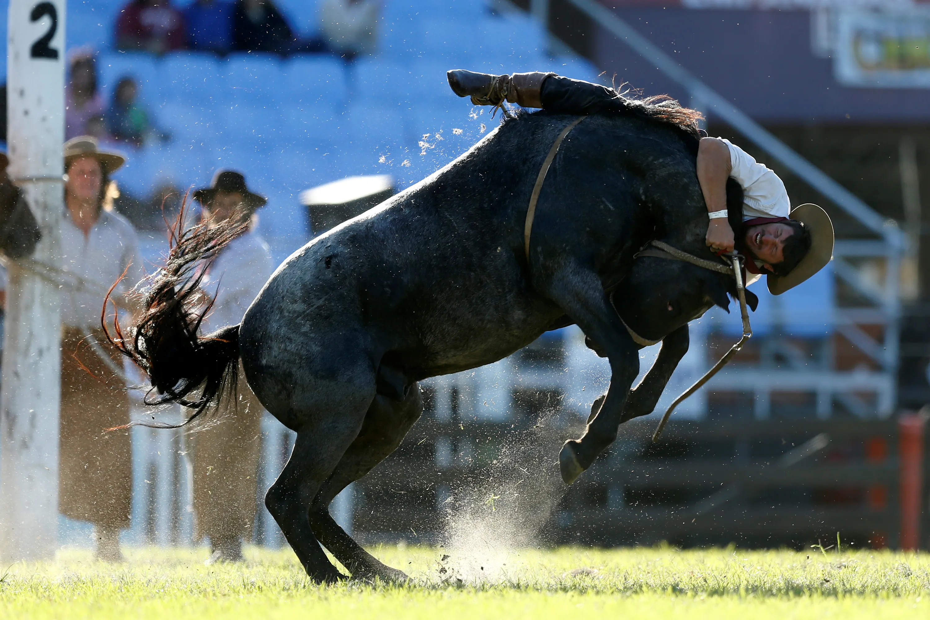A gaucho is unseated by an untamed horse during the Creole week celebrations in Montevideo, Uruguay on March 26, 2018. (Photo by Andres Stapff/Reuters)
