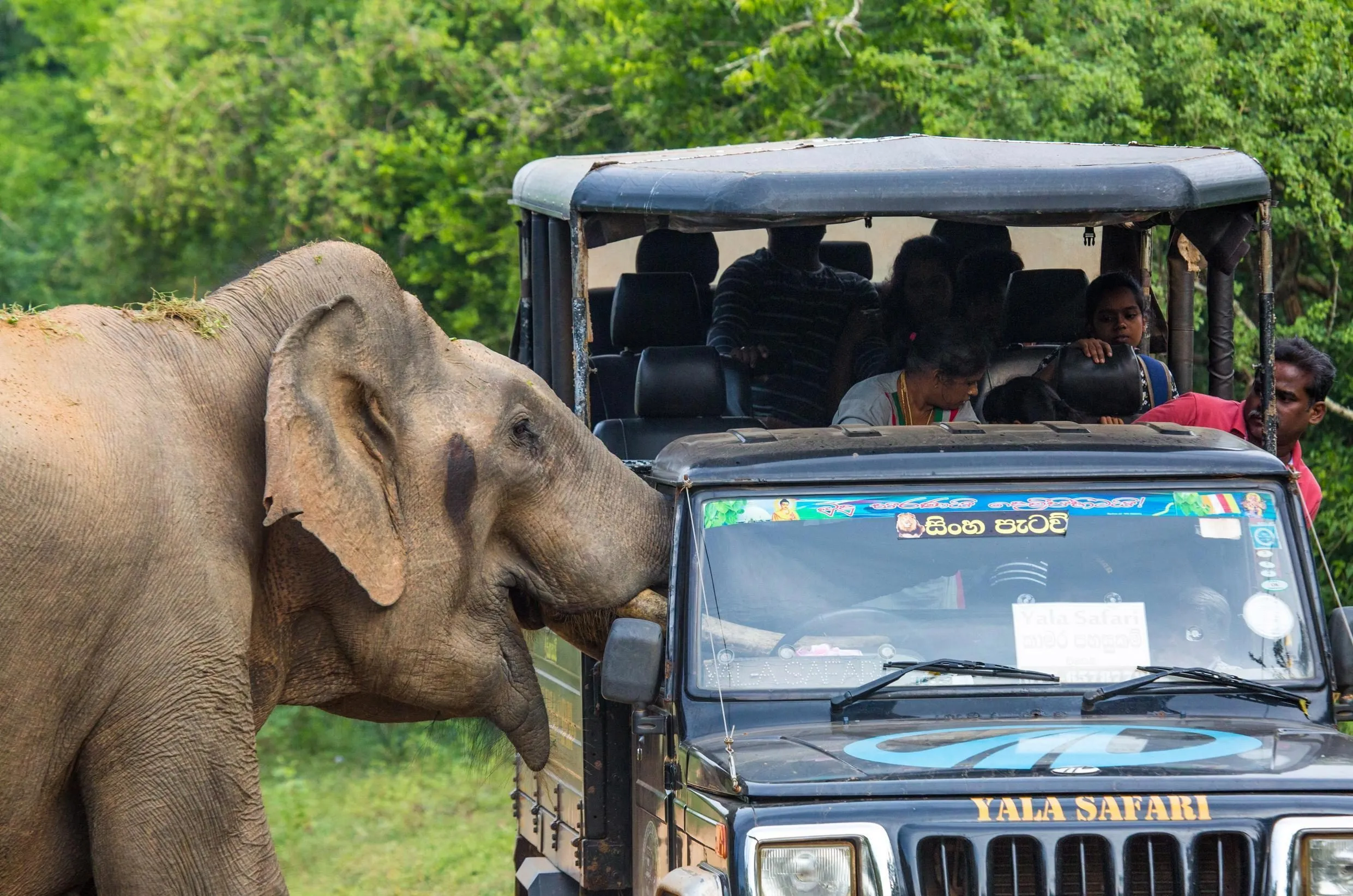 Holidaymakers had a close call when a curious elephant poked its head into their safari jeep to look for food and nearly tipped the vehicle over. (Photo by Sergey Savvi/Solent News & Photo Agency)