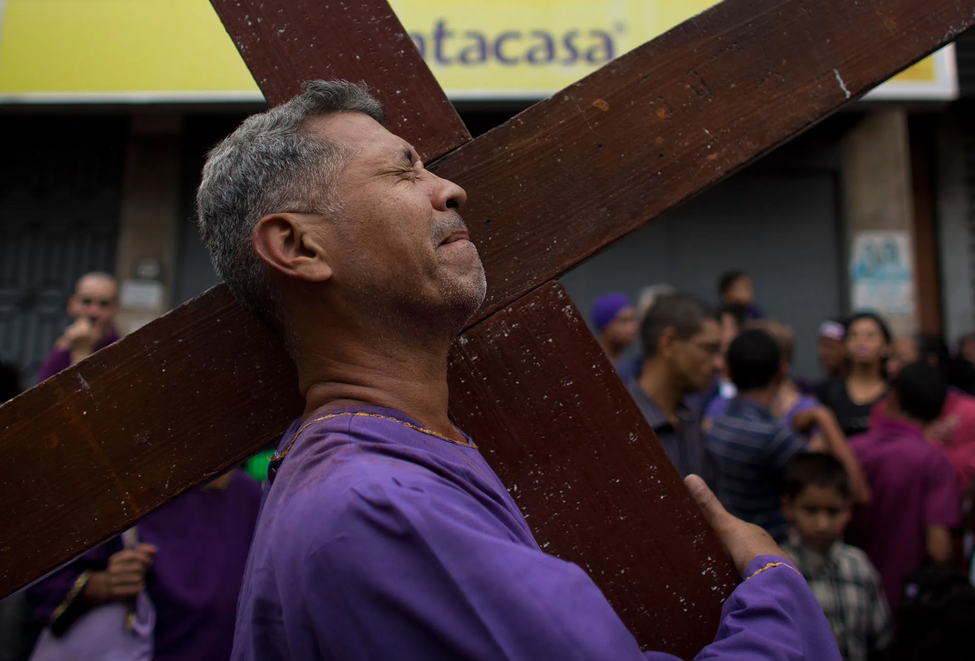 A man carries a cross during the procession of the “Nazareno de San Pablo” outside Santa Teresa Cathedral during Holy Week in Caracas, Venezuela, Wednesday, March 28, 2018. (Photo by Ariana Cubillos/AP Photo)