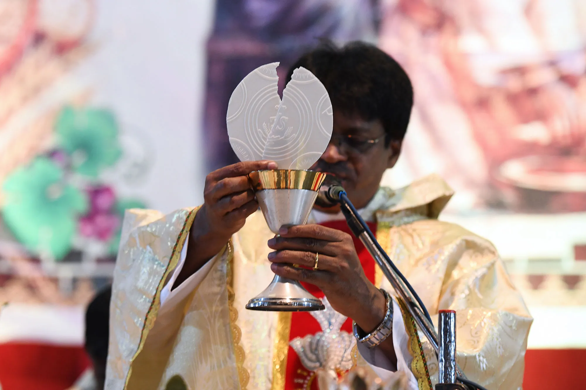 Indian Catholic Priest Father Jaya Raj celebrates mass during a Maundy Thursday service at the St. Alphonsus Church in Hyderabad on March 29, 2018. The ceremony commemorates the symbolic cleansing by Jesus Christ of his apostles at the last supper on the eve of his crucifixion. (Photo by Noah Seelam/AFP Photo)