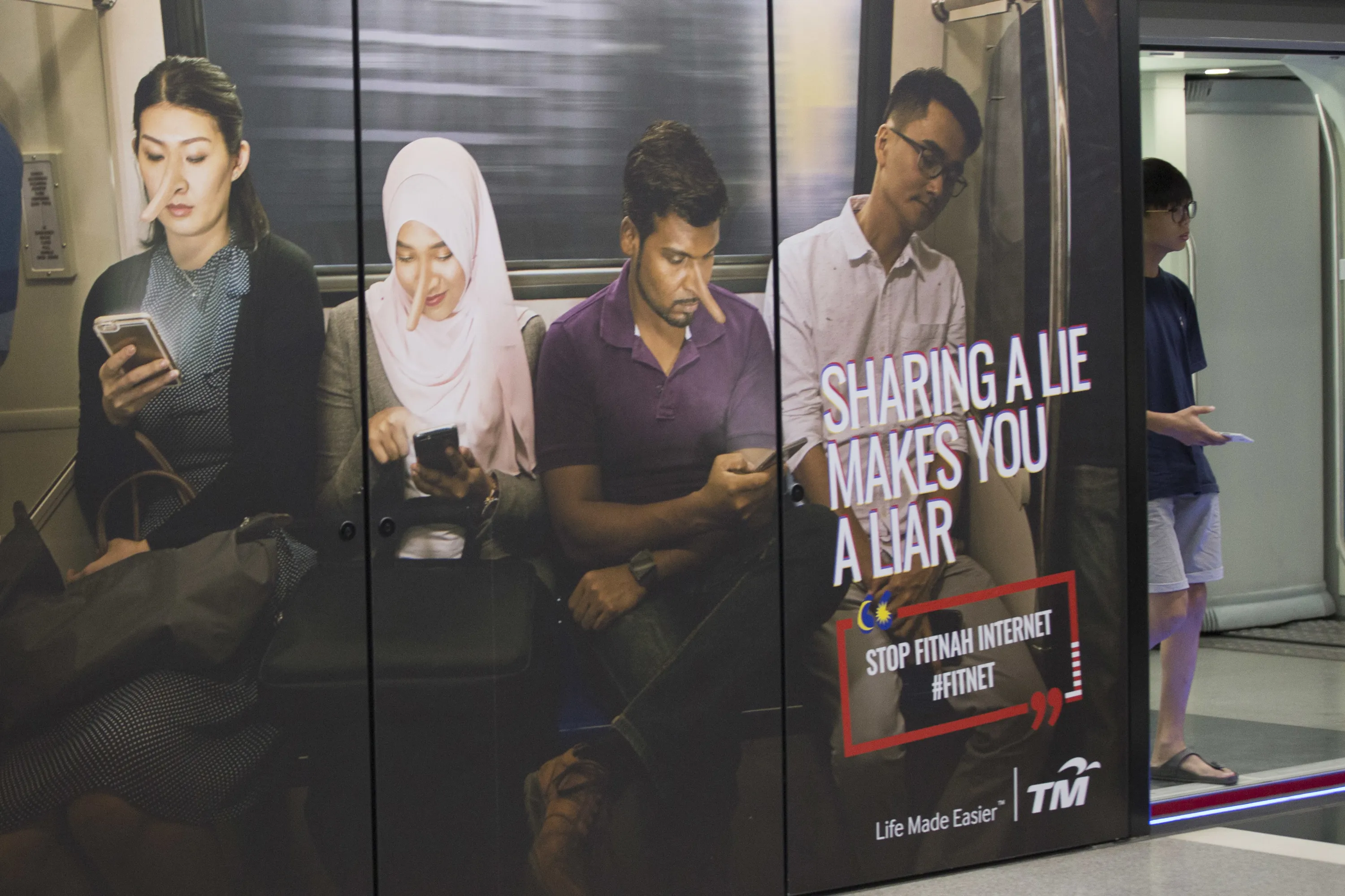 A commuter walks past an advertisement discouraging the dissemination of fake news at a train station in Kuala Lumpur, Malaysia, Thursday, March 29, 2018. (Photo by Vincent Thian/AP Photo)