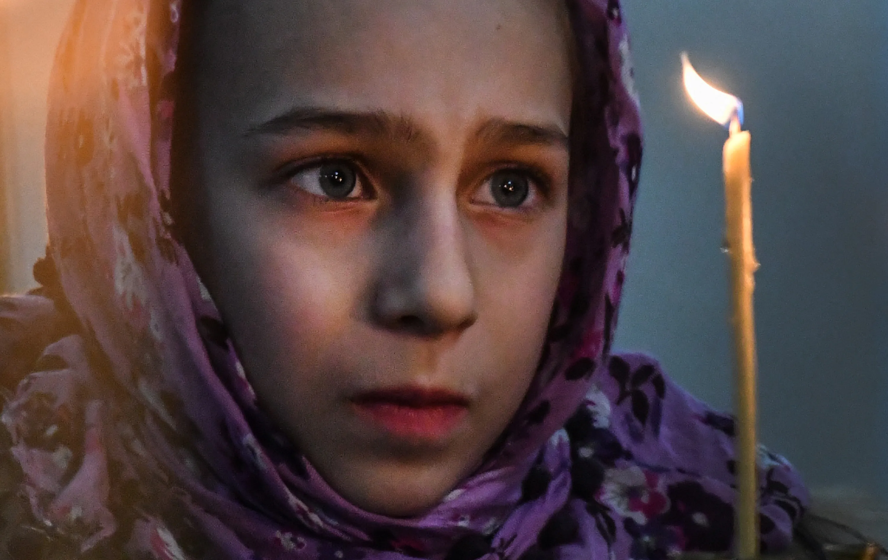 A girl looks on candle during an Orthodox Christmas service in a church in Bishkek late on January 6, 2018. Orthodox Christians celebrate Christmas on January 7 in the Middle East, Russia and other Orthodox churches that use the old Julian calendar instead of the 17th-century Gregorian calendar adopted by Catholics, Protestants, Greek Orthodox and commonly used in secular life around the world. (Photo by Vyacheslav Oseledko/AFP Photo)