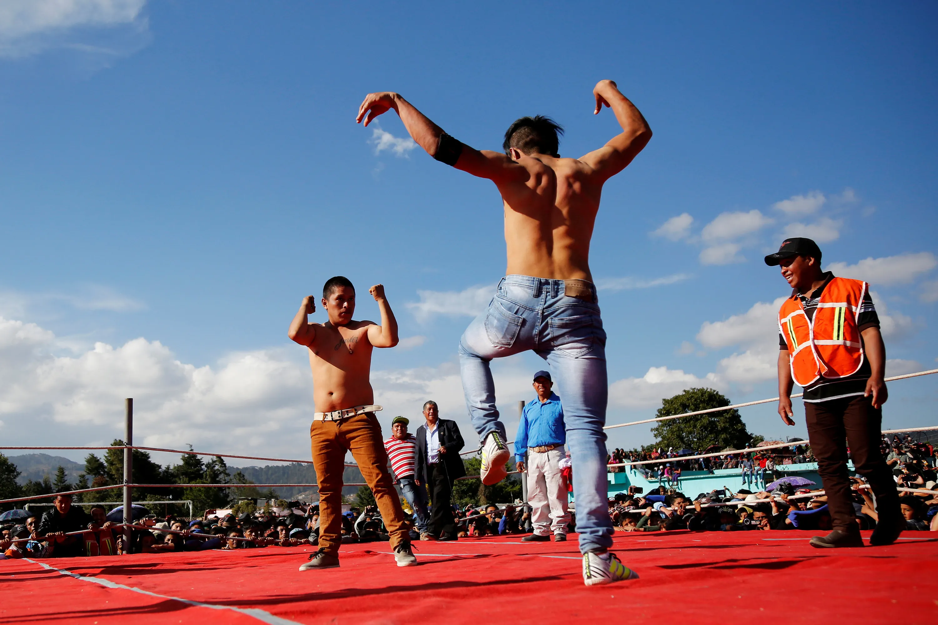 Two men participate in a bare-knuckle fight as part of a local tradition on Good Friday during Holy Week in the town of Chivarreto, on the outskirts of Guatemala City, Guatemala, March 30, 2018. (Photo by Luis Echeverria/Reuters)