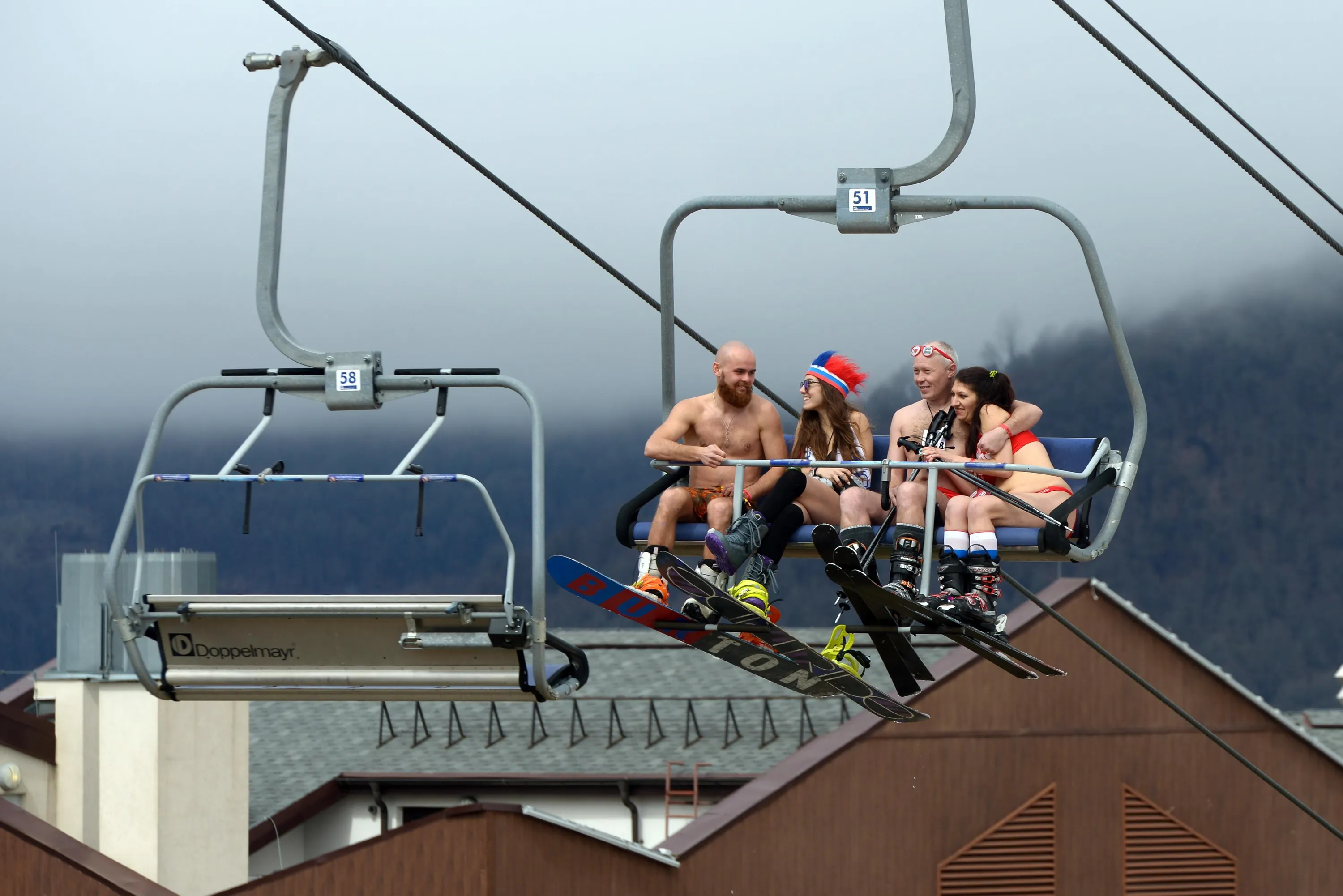 People participating in the BoogelWoogel alpine carnival at the Rosa Khutor Alpine Resort in Krasnaya Polyana, Sochi, Russia seen in a chairlift on March 31, 2018. (Photo by Artur Lebedev/TASS)