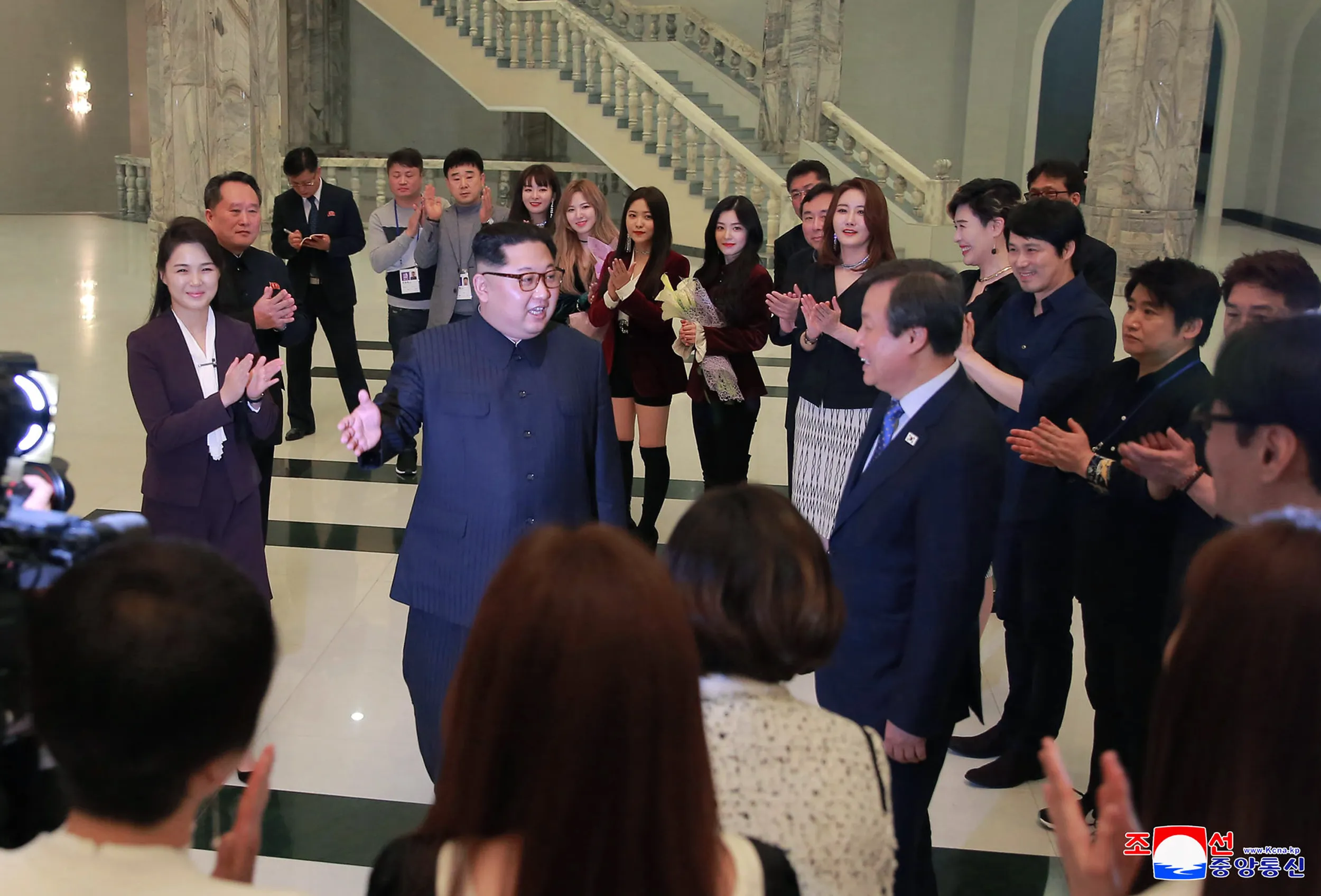 In this photo provided by the North Korean government, North Korean leader Kim Jong Un, center left, talks with South Korean Culture, Sports and Tourism Minister Do Jong-whan, center right, as his wife Ri Sol Ju, left, claps during a visit to members of a South Korean artistic group after their performance in Pyongyang, North Korea, Sunday, April 1, 2018. Kim clapped his hands as he, along with his wife and hundreds of other citizens, watched the rare performance Sunday by South Korean pop stars visiting Pyongyang, highlighting the thawing ties between the rivals after years of heightened tensions over the North's nuclear program. Independent journalists were not given access to cover the event depicted in this image distributed by the North Korean government. The content of this image is as provided and cannot be independently verified. Korean language watermark on image as provided by source reads: “KCNA” which is the abbreviation for Korean Central News Agency. (Photo by Korean Central News Agency/Korea News Service via AP Photo)
