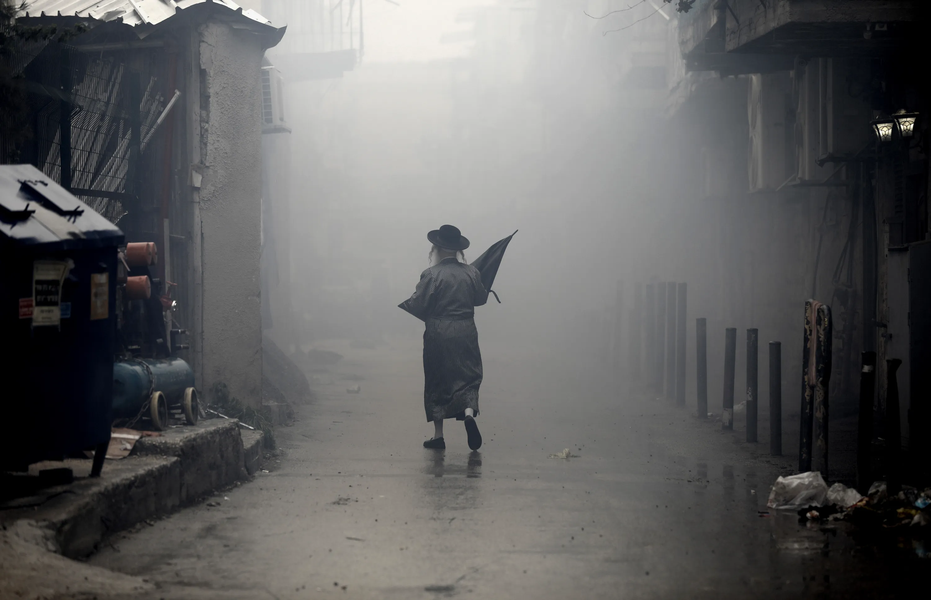 An Ultra-Orthodox Jewish man walks down a street through the smoke from burning leavened items during the Srefat Chametz ritual on March 30 2018 in Jerusalem on the eve of the Jewish Pesach (Passover) holiday, which begins at sunset today. Due to the haste with which the Jews left Egypt, the bread they had prepared for the journey did not have time to rise.