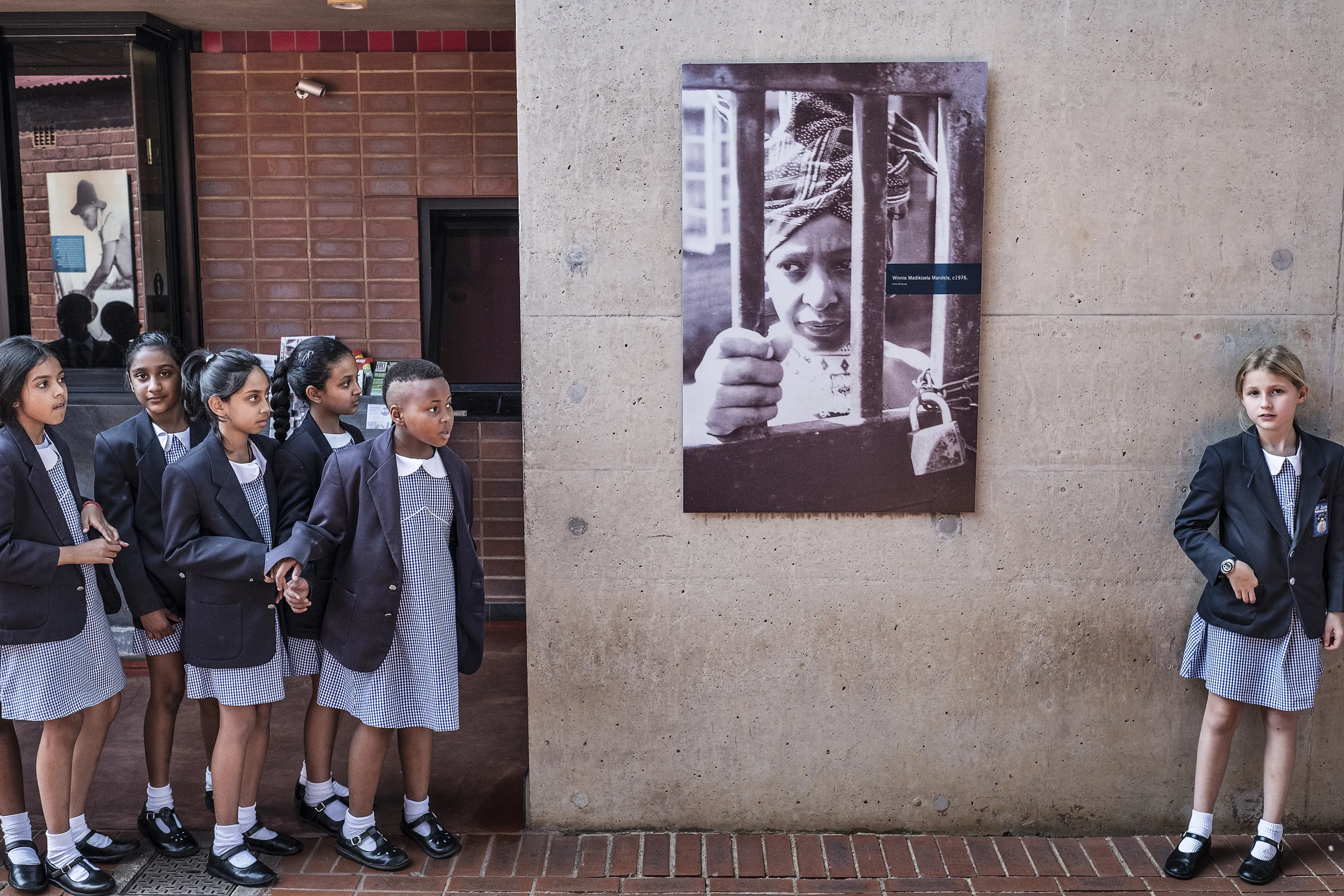South African school children pause next to a portrait of the late South African anti-apartheid campaigner Winnie Madikizela-Mandela, ex-wife of African National Congress (ANC) leader Nelson Mandela, at her house on April 3, 2018 in Soweto. South Africa's President paid tribute to anti-apartheid activist Winnie Mandela, who died on April 2, saying that Nelson Mandela's former wife was a “voice of defiance” against white-minority rule. (Photo by Marco Longari/AFP Photo)