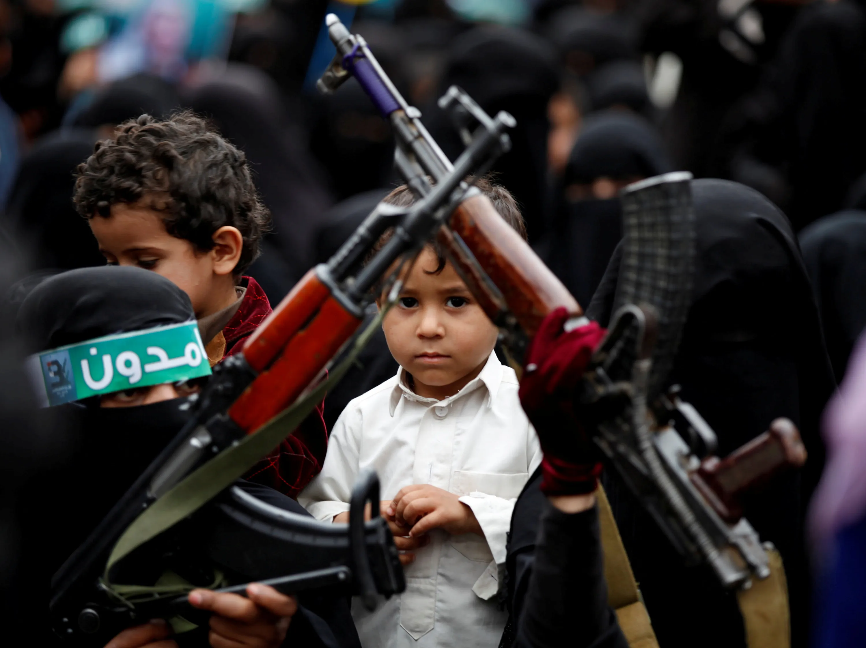 A boy looks on as he attends a demonstration by woman loyal to the Houthi movement against an alleged rape of a Yemeni woman by a coalition soldier, in Sanaa, Yemen April 2, 2018. (Photo by Khaled Abdullah/Reuters)
