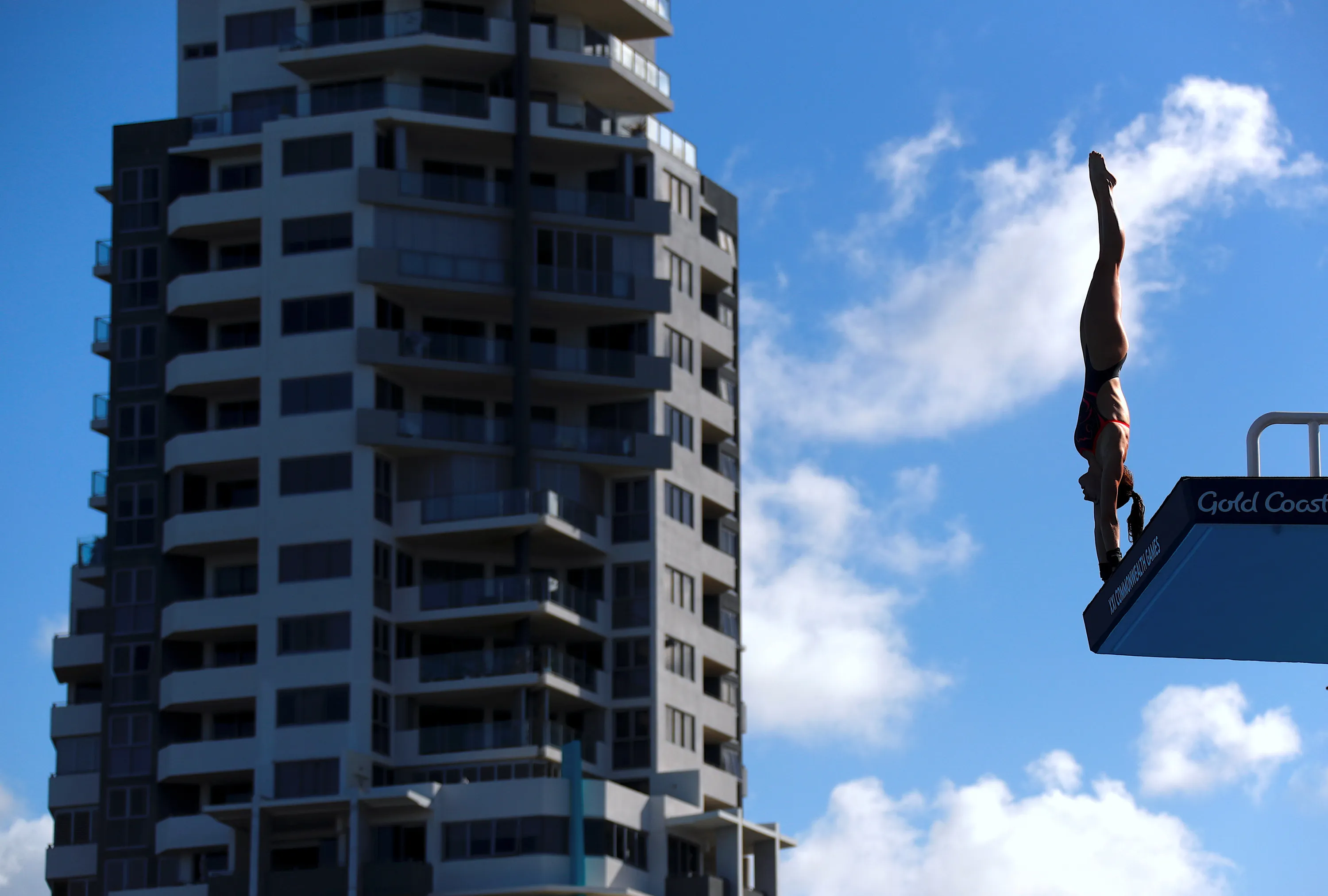 A diver performs a handstand on the ten-metre platform during a training session ahead of the Commonwealth Games on the Gold Coast, Australia April 3, 2018. (Photo by David Gray/Reuters)