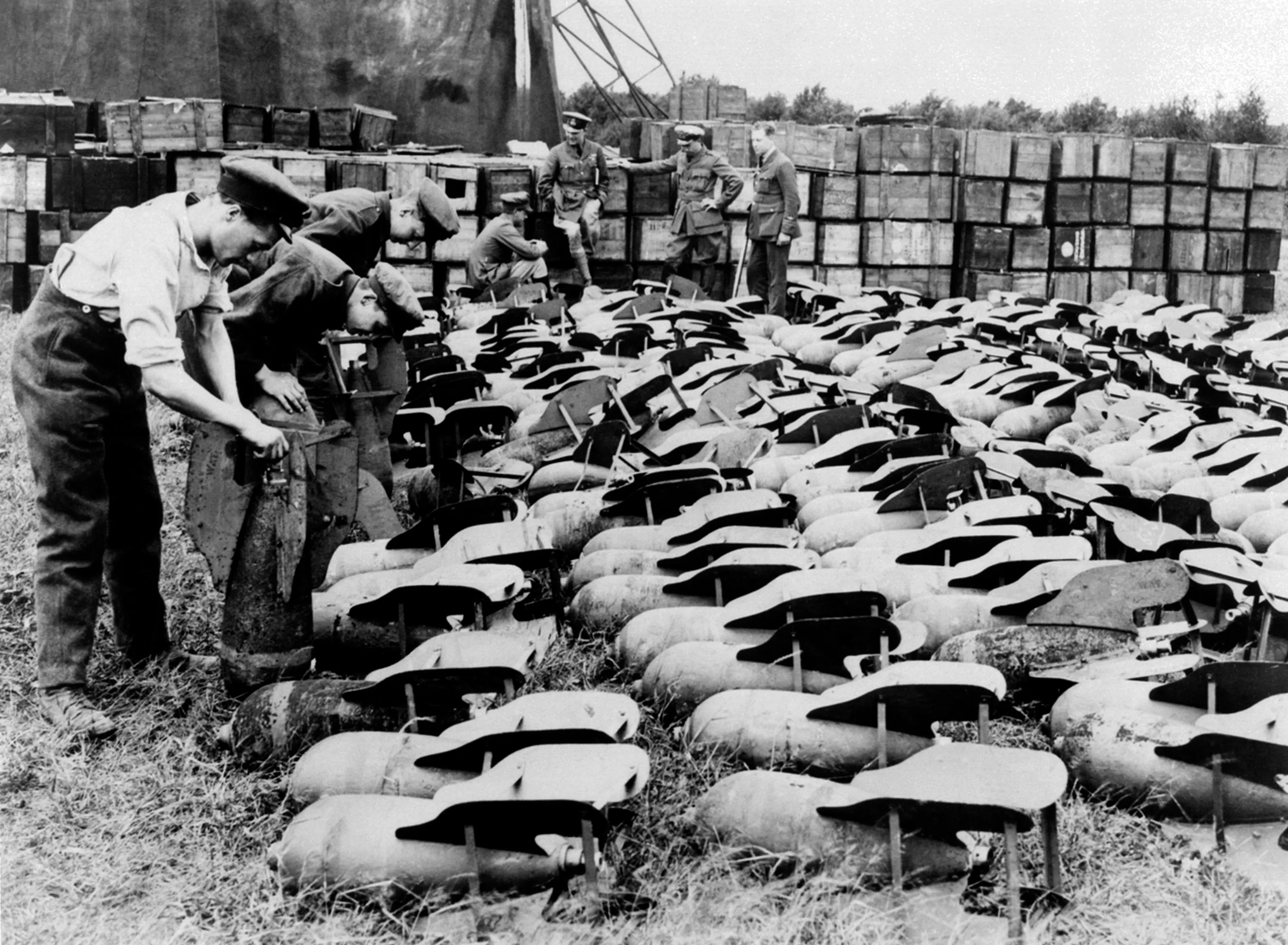 Armourers prepare the full complement of 112lb bombs needed for night bombing operations by the FE2bs of 149 Squadron at Saint-Omer, France, 1918. (Photo by Air Historical Branch/RAF/PA Wire)