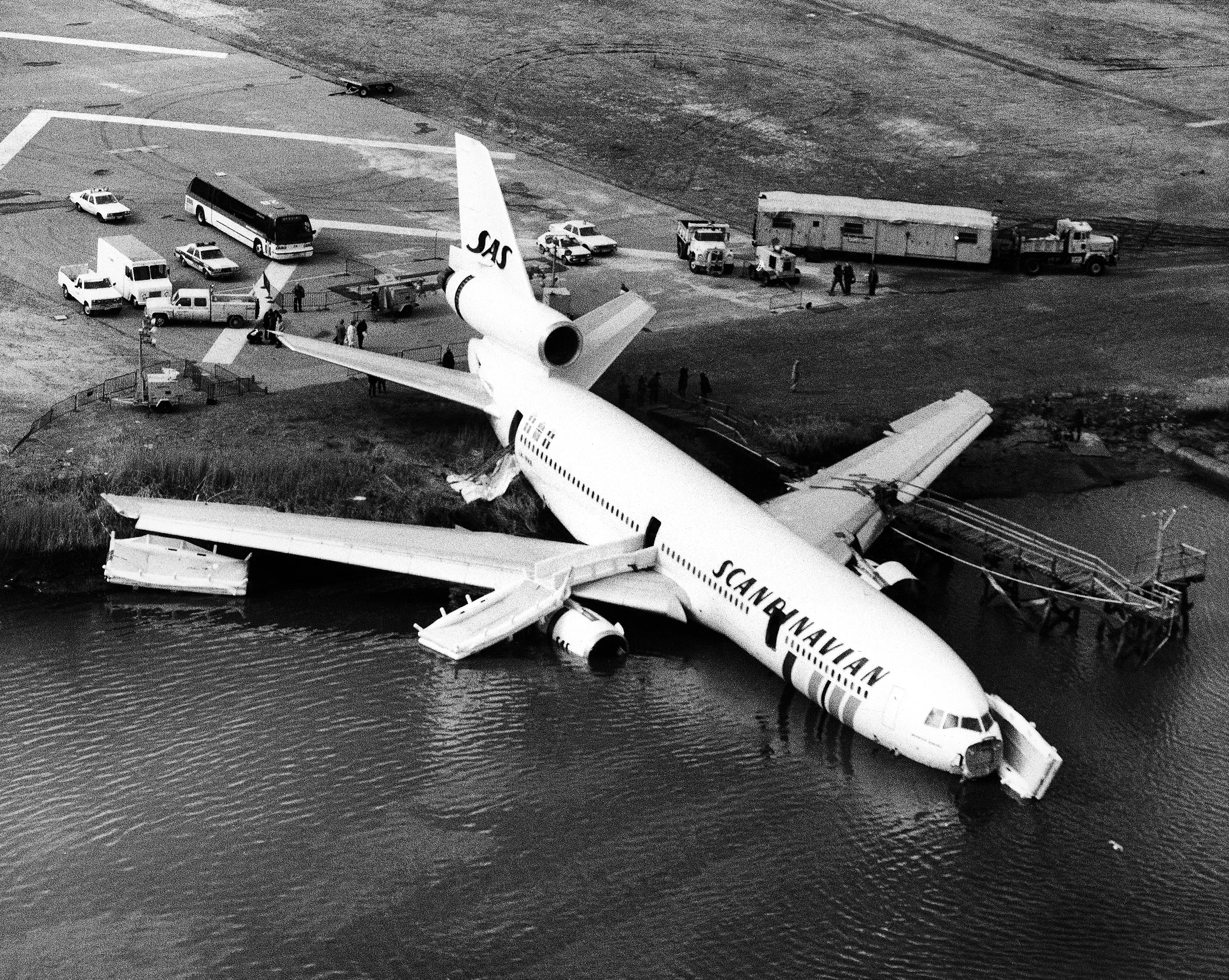A Scandinavian Airlines jumbo jet lies in a 12 foot creek Wednesday after sliding off a wet runway at New York's John F. Kennedy Airport, USA on Tuesday February 28, 1984. The plane had flow in from Stockholm via Oslo and landed in drizzle and fog. 10 minor injuries were reported. (Photo by David Pickoff/AP Photo)