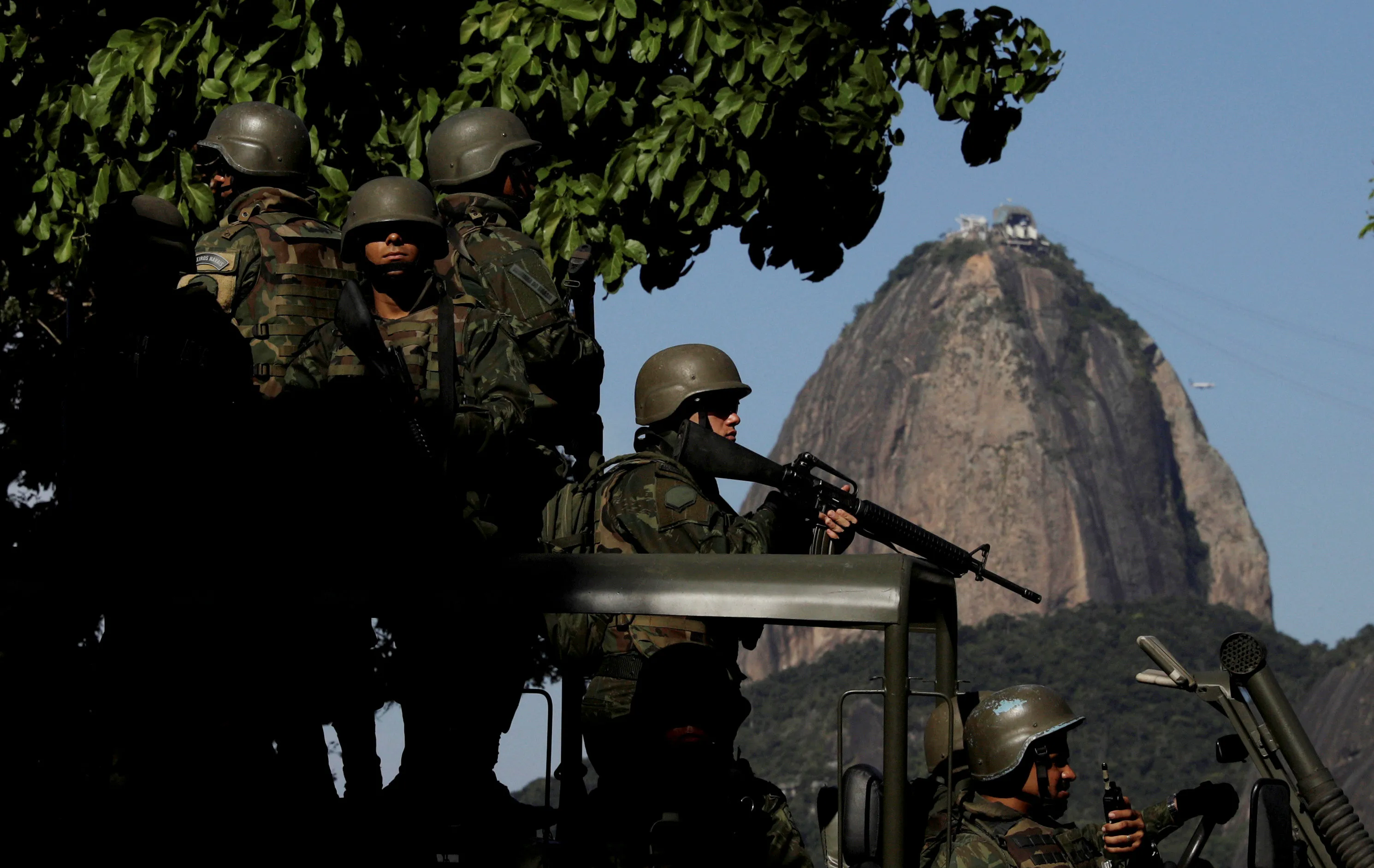 Brazilian marines patrol the streets of Botafogo neighborhood with Sugar Loaf mountain on background in Rio de Janeiro, Brazil April 3, 2018. (Photo by Ricardo Moraes/Reuters)
