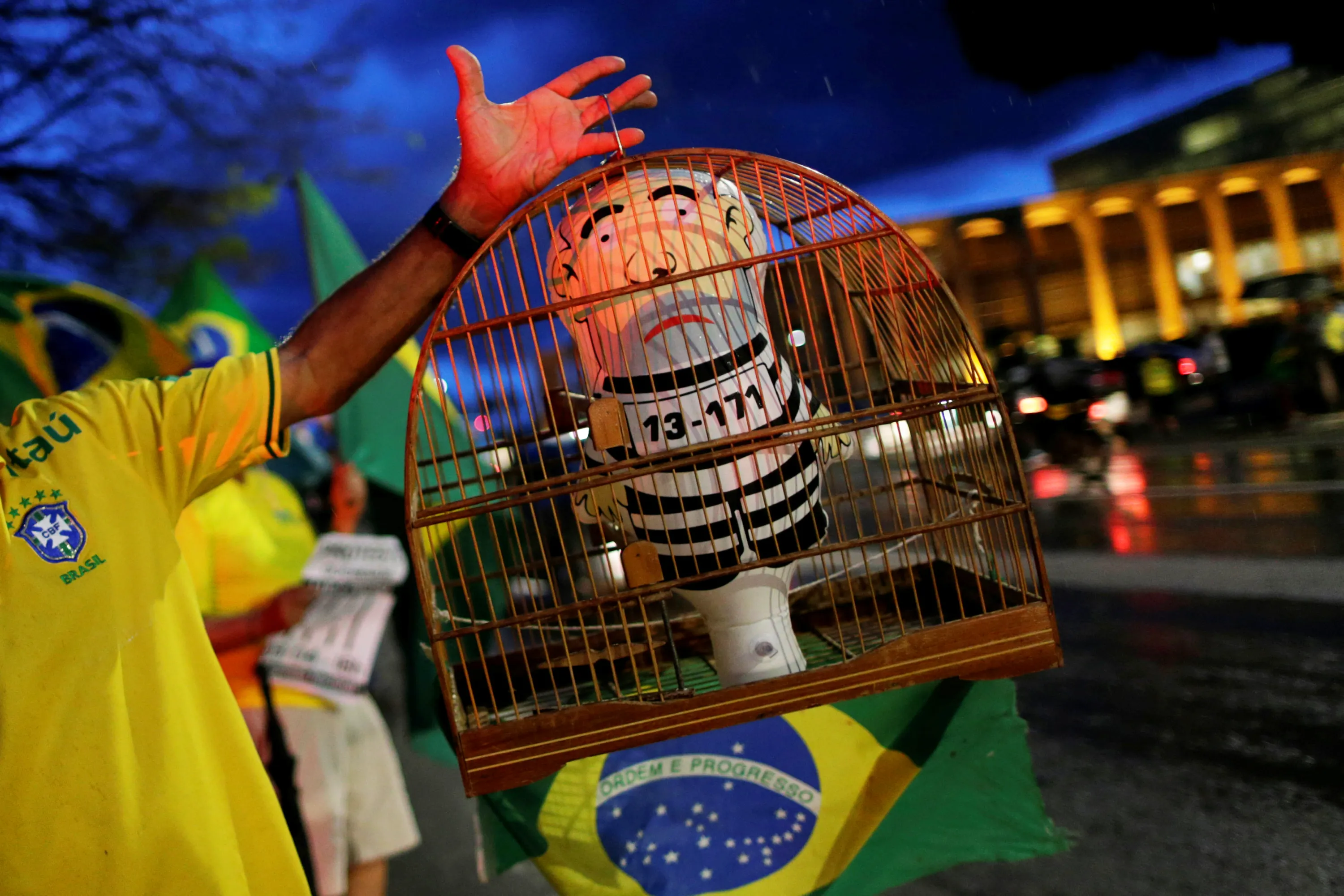 A demonstrator shows a doll depicting the former Brazilian President Luiz Inacio Lula da Silva in jail during a protest against Lula da Silva in Brasilia, Brazil, April 3, 2018. (Photo by Adriano Machado/Reuters)