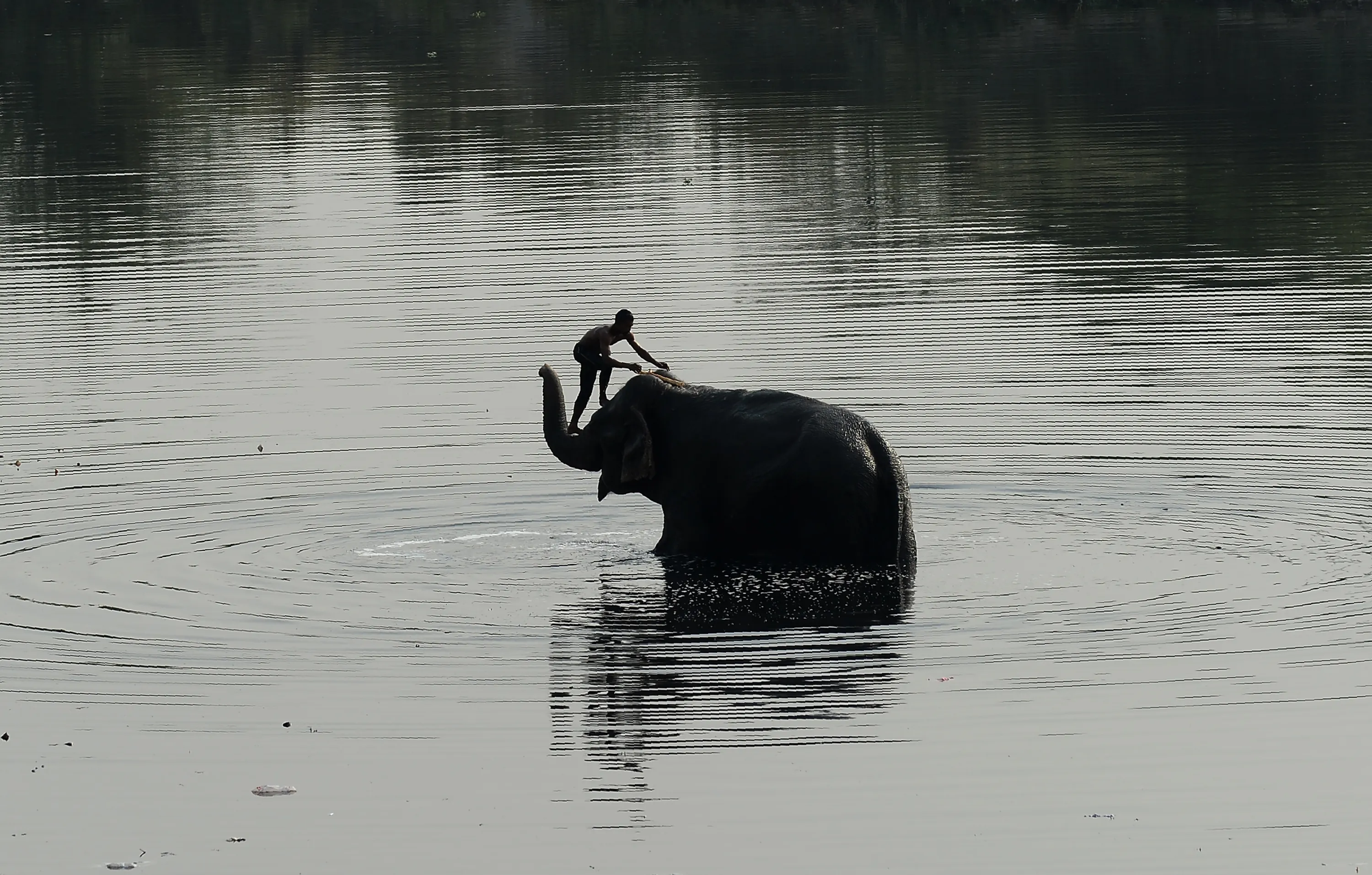 An Indian mahout washes his elephant in the Yamuna River in New Delhi on April 3, 2018. (Photo by Sajjad Hussain/AFP Photo)