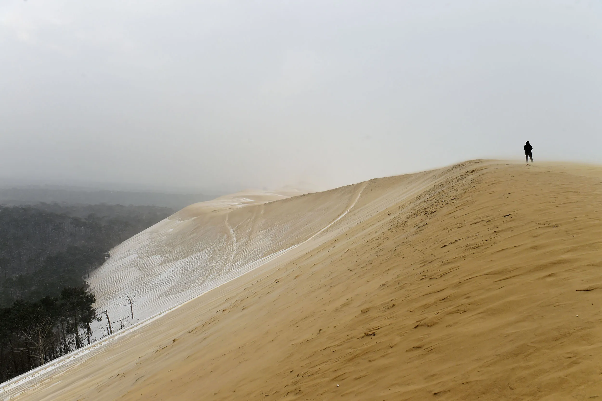 A man walks on the partially snow covered Pyla sand dune after snow fall on February 28, 2018 in La Teste-de-Buch, southwestern France. Europe remained on February 28 gripped by a blast of Siberian weather, accounting for at least 24 deaths and carpeting palm-lined Mediterranean beaches in snow. (Photo by Nicolas Tucat/AFP Photo)