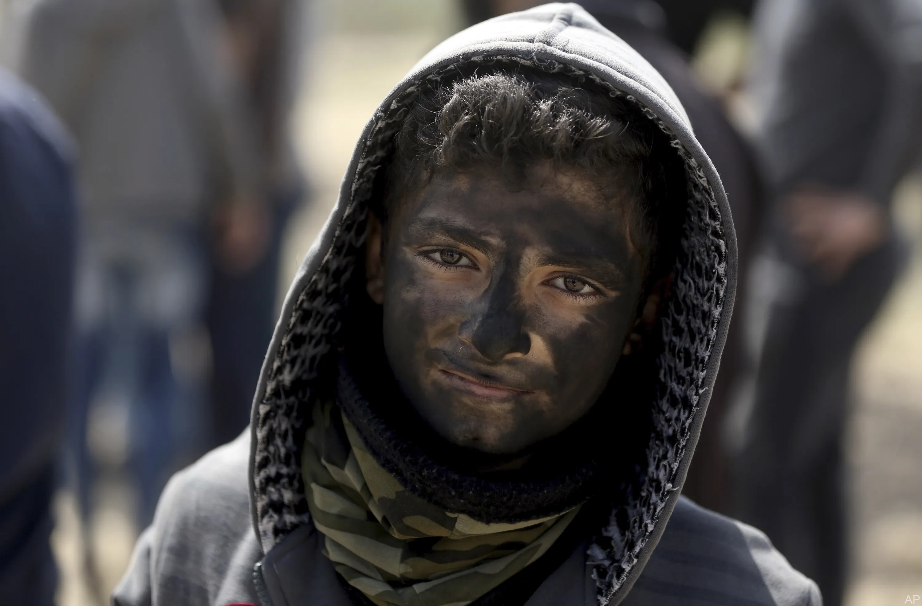 A Palestinian boy poses for a photograph as he paints his face in black during a protest at the Gaza Strip's border with Israel, Friday, April 6, 2018. (Photo by Khalil Hamra/AP Photo)
