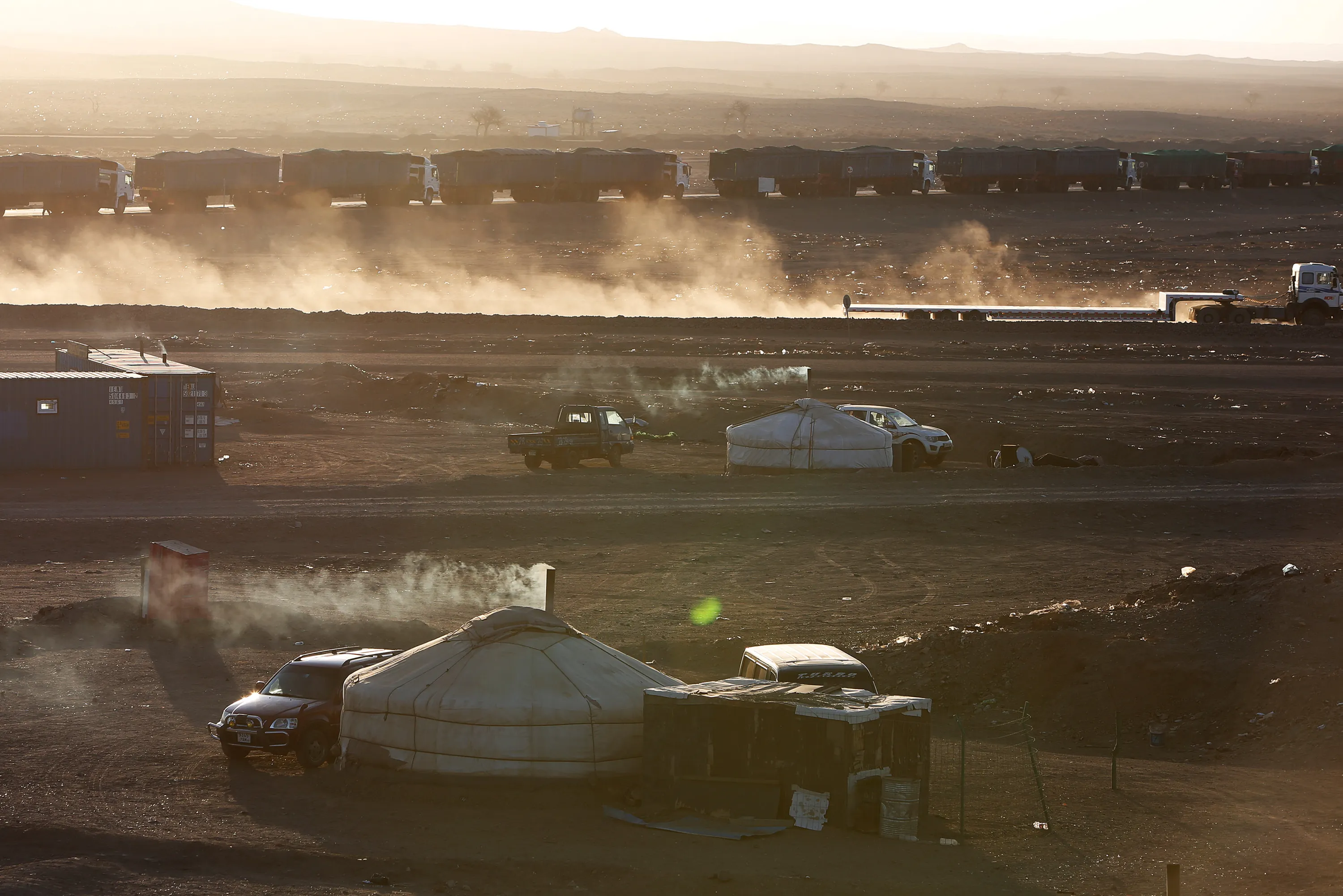 Trucks filled up with coal are lined up in the early morning in Khanbogd Soum, some 20 kilometres from the border with China, in the Gobi desert, Mongolia, October 30, 2017. (Photo by Bazarsukh Rentsendorj/Reuters)