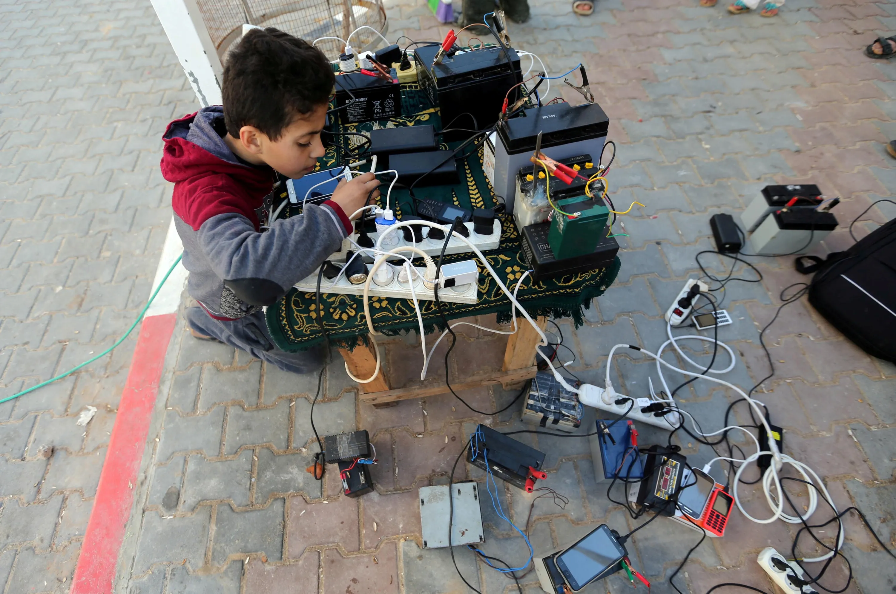 A Palestinian boy charges a mobile phone from batteries offered as a free service in his neighborhood which experiences power shortages, in Johr El-Deek in Gaza January 31, 2018. (Photo by Ibraheem Abu Mustafa/Reuters)