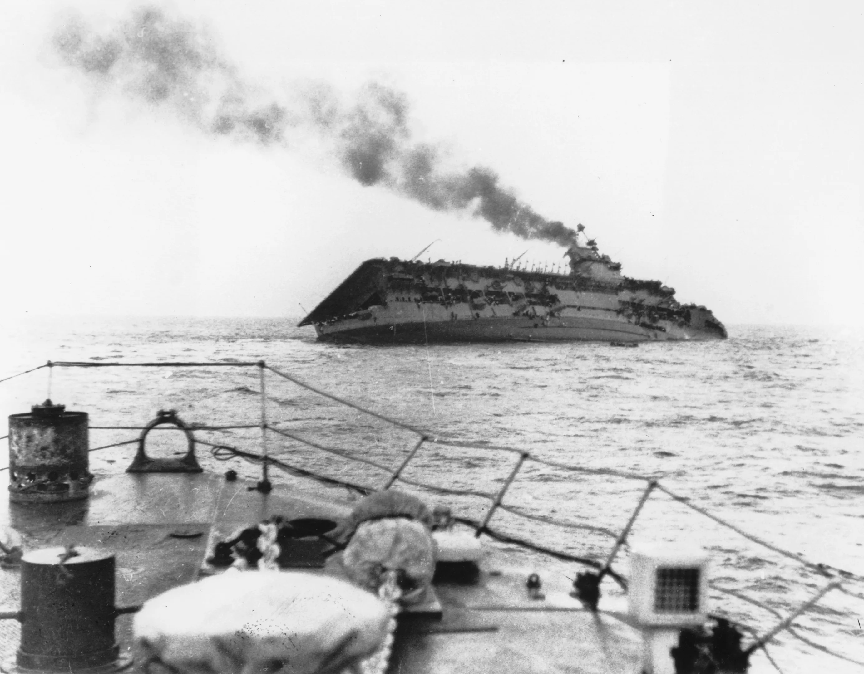 On September 17, 1939, the Royal Navy aircraft carrier HMS Courageous is hit by a torpedo from the German submarine U29 and sinks within 20 minutes, southwest off Ireland, taking almost half of the crew with her. (Photo by AP Photo)