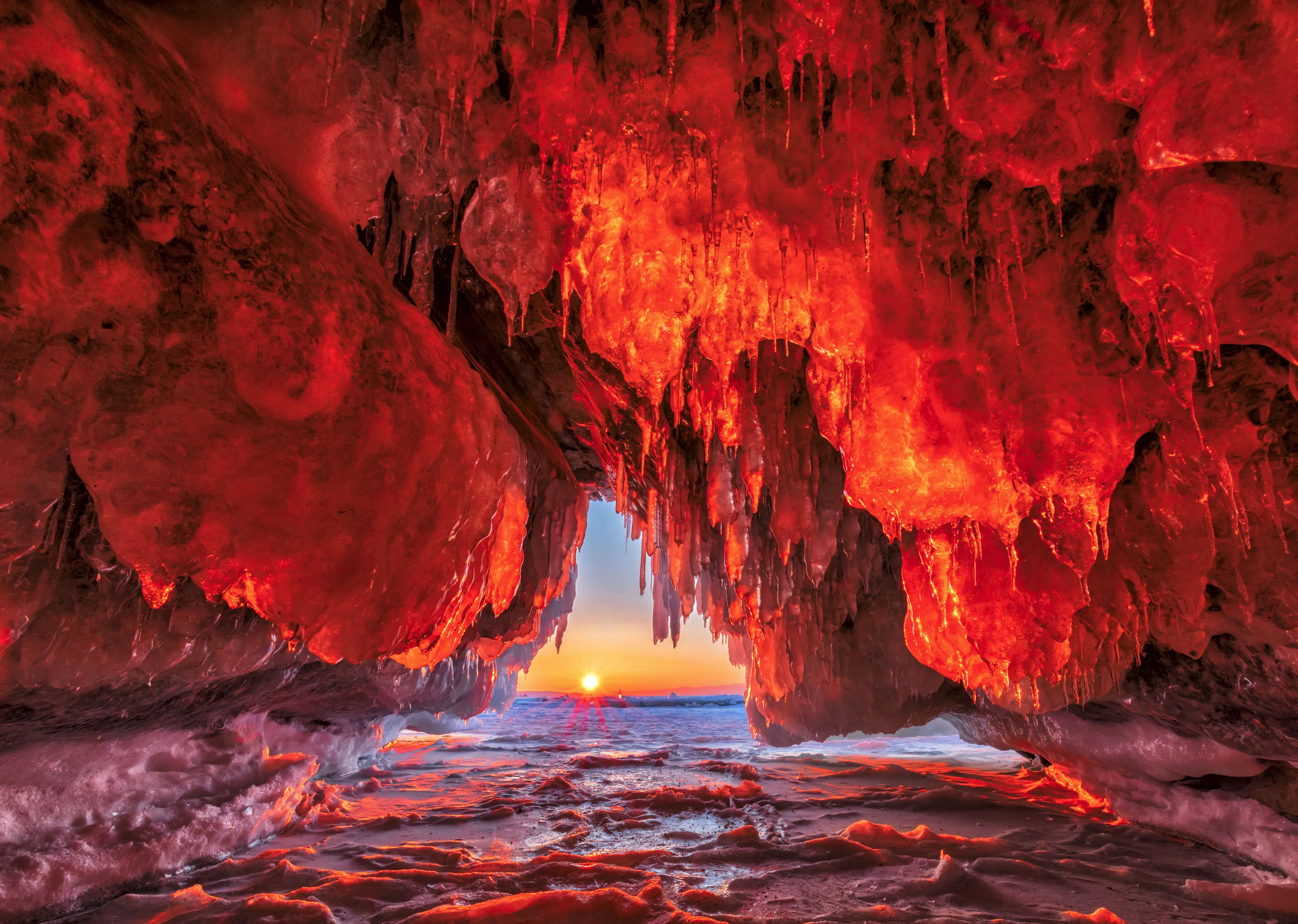 These stunning photographs really do show a land of fire and ice! The frozen landscape of the Olkhon Islands, Russia, appears to be ablaze in some of these pictures as the icy sheets of the glaciers reflect the early morning suns rays. Despite the sub-zero temperatures on the islands, the island is frequently bathed in a low sunlight during the winter months – leading to the formation of these incredible caves, full of icy stalactites. Photographer Vladimir Ryabkov, from Moscow, snapped these incredible images during a visit in March. (Photo by Vladimir Ryabkov/Caters News Agency)