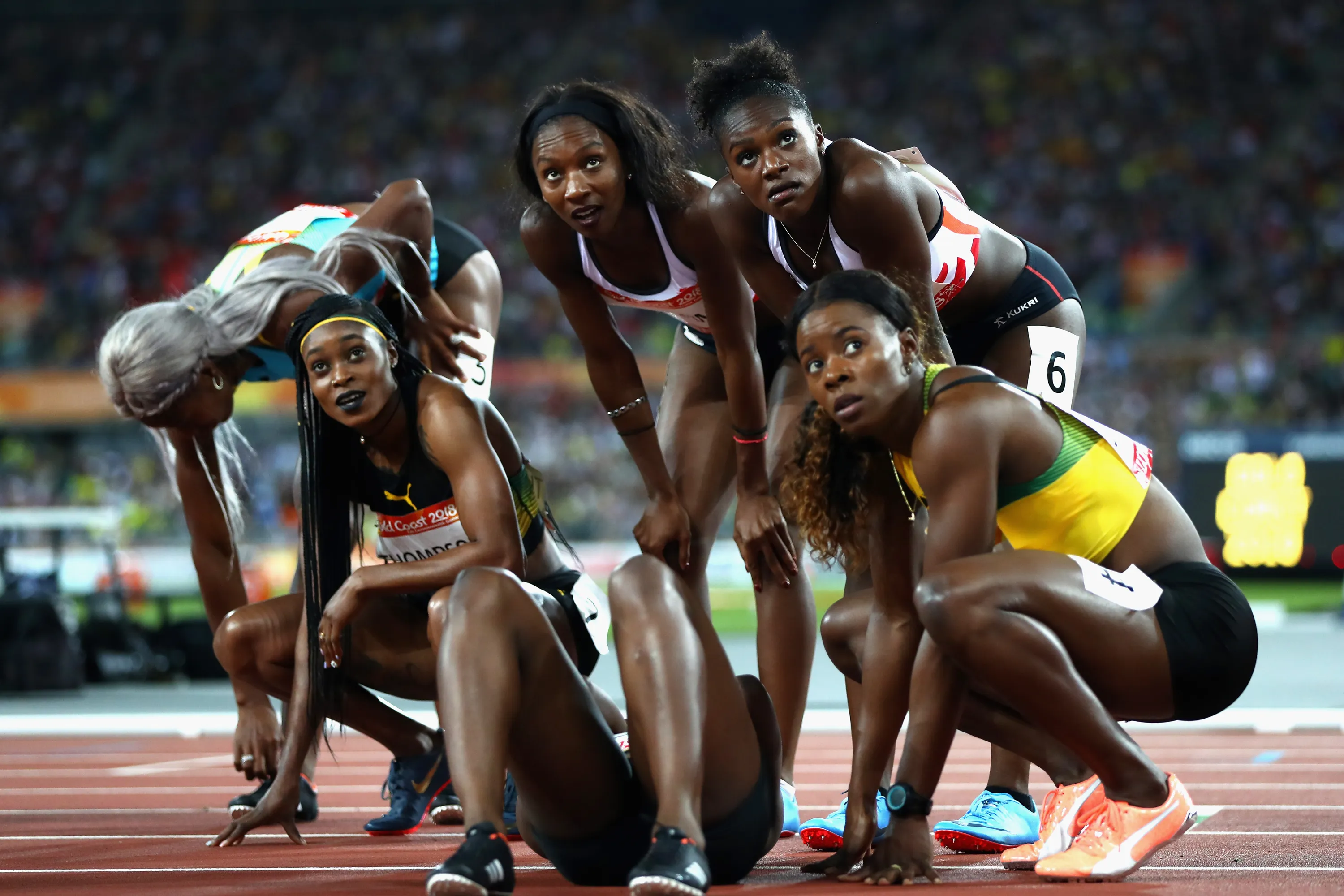Elaine Thompson of Jamaica, Bianca Williams of England, Dina Asher-Smith of England and Shericka Jackson of Jamaica look at the scoreboard after the Women's 200 metres final during athletics on day eight of the Gold Coast 2018 Commonwealth Games at Carrara Stadium on April 12, 2018 on the Gold Coast, Australia. (Photo by Michael Steele/Getty Images)