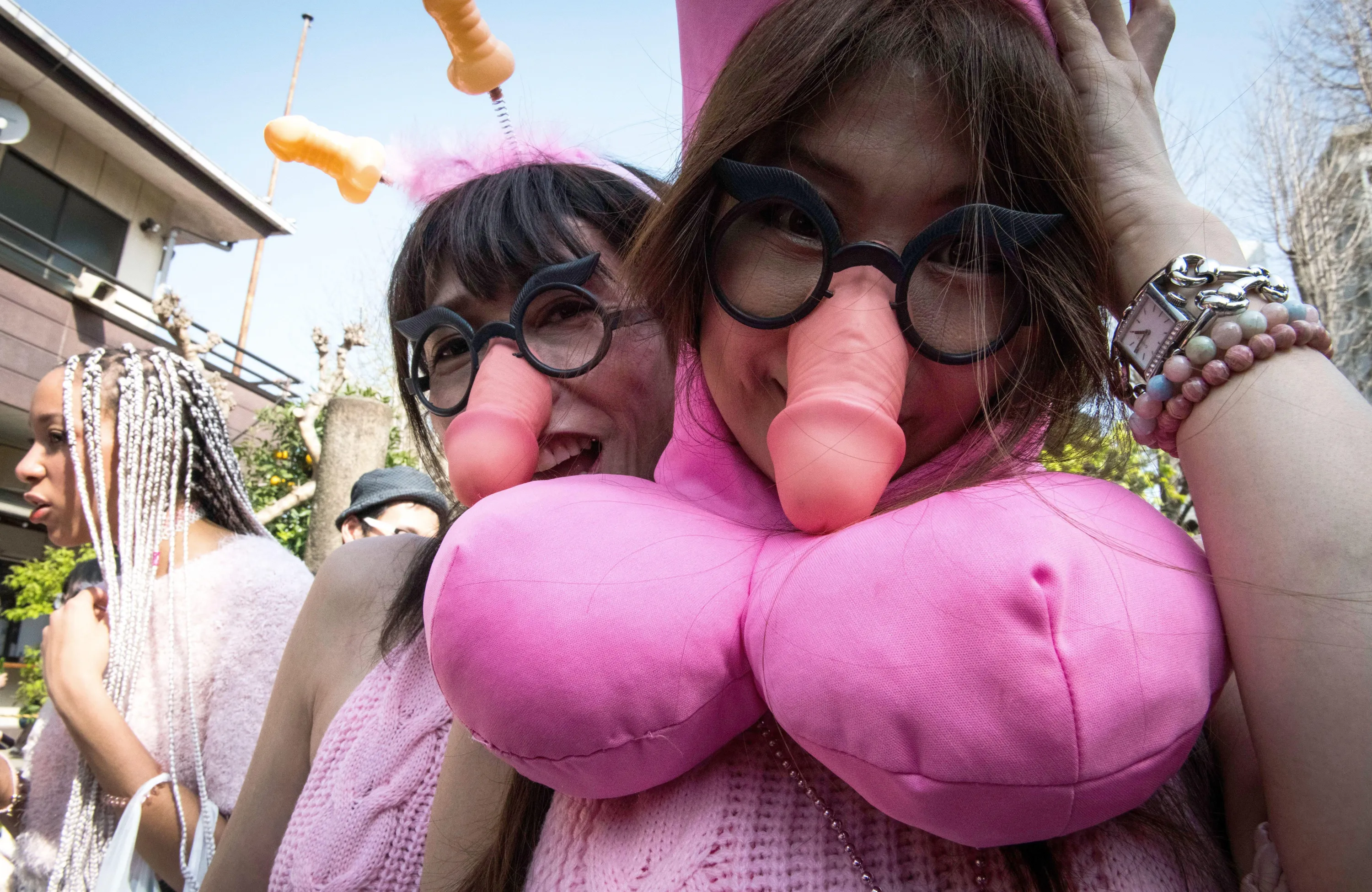 Festival goers pose for photos with their phallic shaped souvenirs during the annual Kanamara Festival at Kanayama Shrine in Kawasaki, Japan on April 1, 2018. The fertility festival, originated from prostitutes who wished to pray for good business and protection from sexually transmitted diseases, nowadays, festival goers celebrates for fertility, relationships and for safe sex practices. Attracting tens of thousands of festival goers including tourists, people can buy penis shape candies, key chains, trinkets, pens, chocolates and even toy glasses with a plastic penis nose. (Photo by Aflo/Rex Features/Shutterstock)