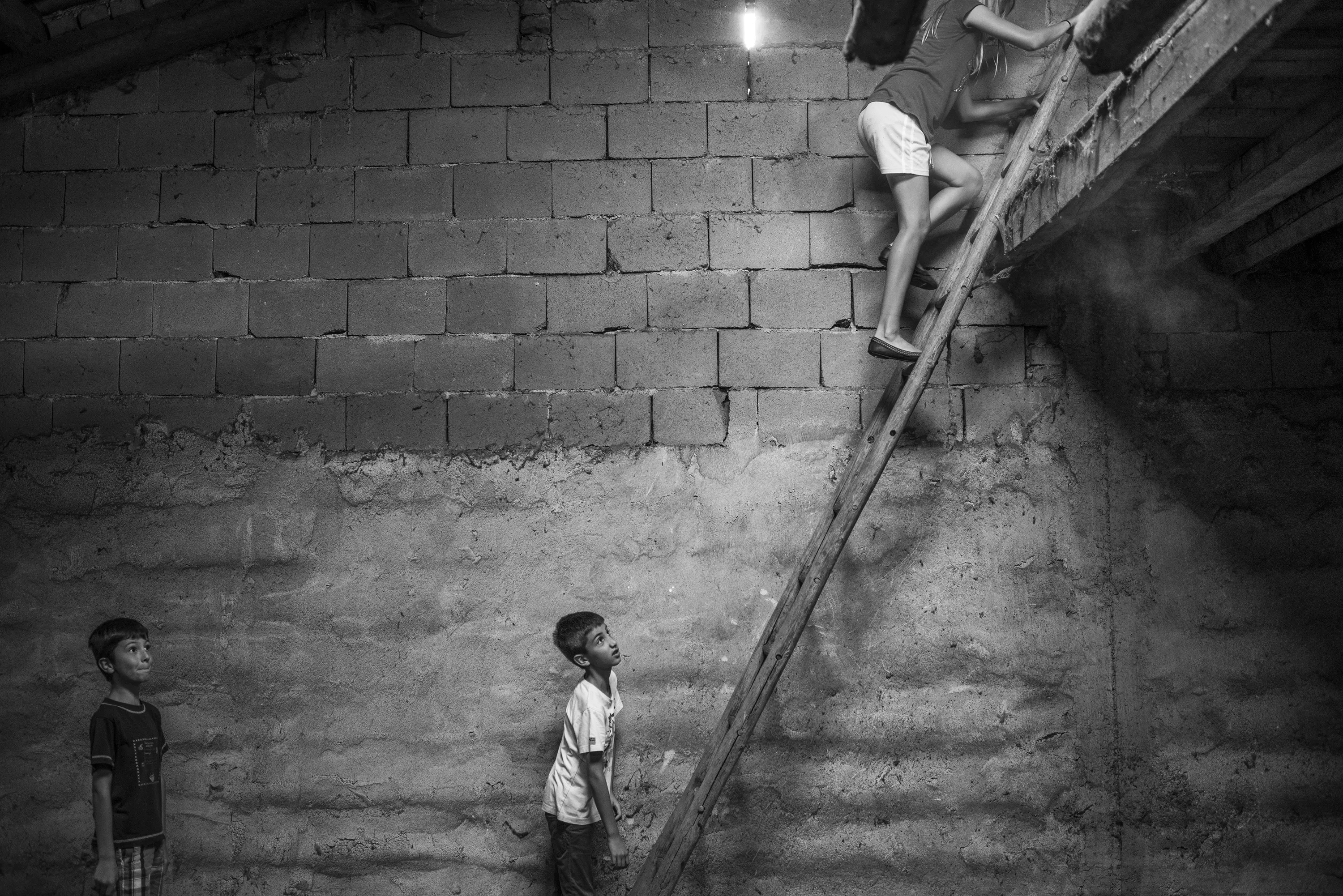 Ich bin waldviertel: Ich Bin Waldviertel: Martin and Christian (brothers who spend their summer holidays in Waldviertel) watch Alena in one of the barns, August 6, 2014. Hannah and Alena are two sisters who live in Merkenbrechts, a bioenergy village of around 170 inhabitants in Waldviertel, an isolated rural area of Austria, near the Czech border. The girls have two older brothers, but spend much of their time together in a carefree life, swimming, playing outdoors and engrossed in games around the house. A bioenergy village is one which produces most of its own energy needs from local biomass and other renewable sources. The photographer has been photographing Hannah and Alena since 2012. She visits them for a few weeks, usually at summertime, every year, watching them growing up and spending time together. (Photo by Carla Kogelman//World Press Photo)