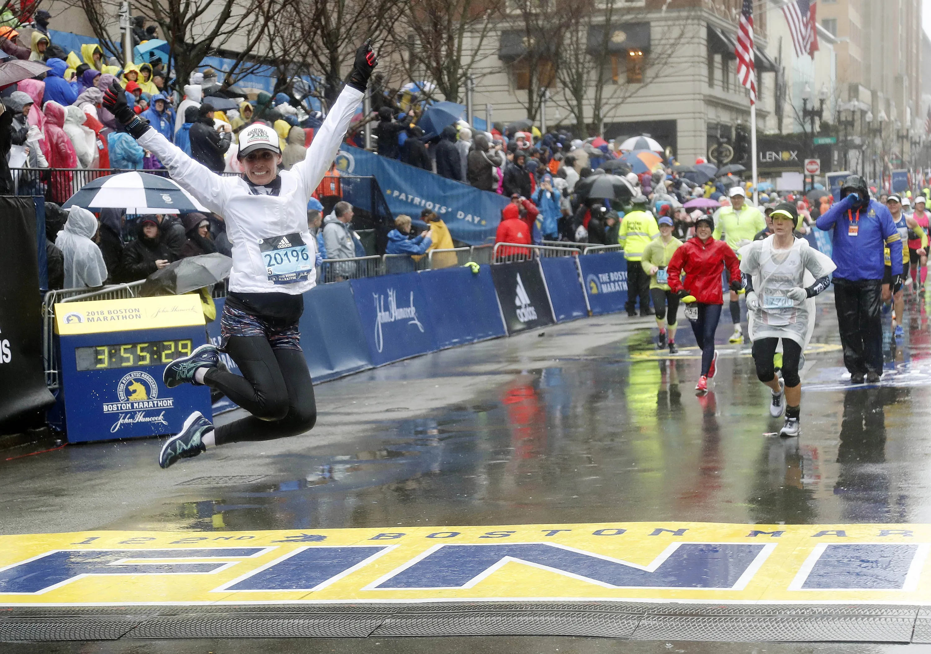 Jodi Broz of Stevenson Ranch, California jumps at the finish line of the 122nd Boston Marathon in Boston, Massachusetts, April 16, 2018. (Photo by Winslow Townson/Reuters/USA TODAY Sports)
