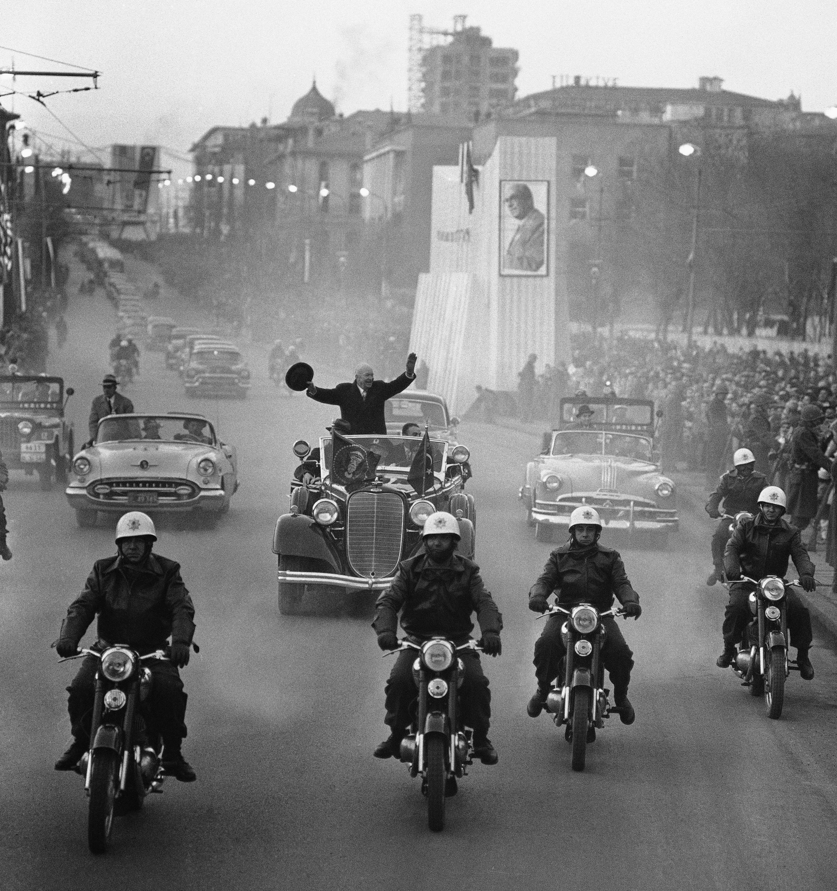 President Eisenhower, arms widespread, stands in open car as he rides down Ataturk Boulevard on his arrival in Ankara, December 6, 1959. (Photo by AP Photo)