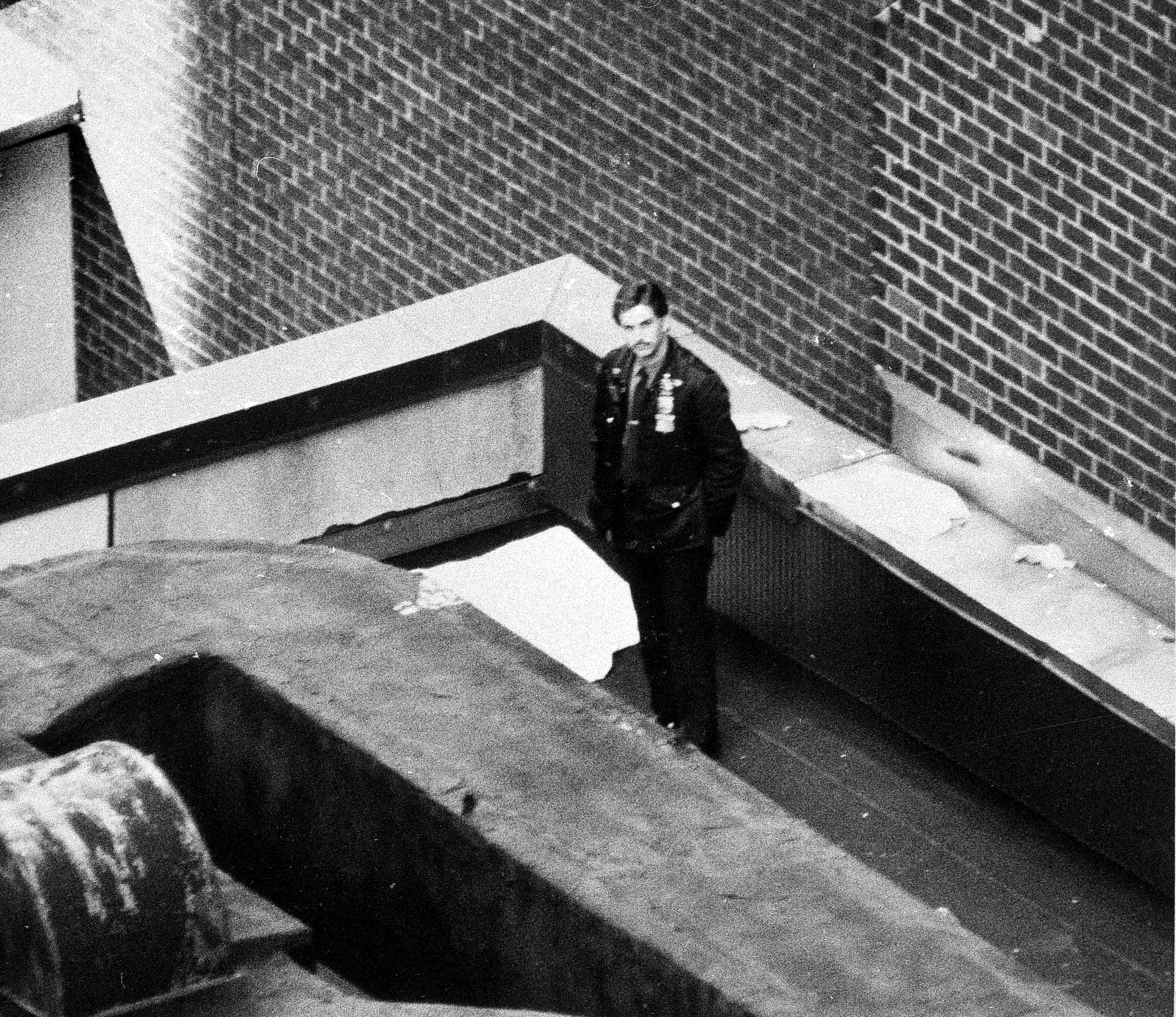 A New York City Police officer stands beside the covered body of 4 1/2-year-old Conor Clapton, son of rock guitarist Eric Clapton and Italian TV star Lori del Santo, who fell from a 53rd-floor window to the roof of a four-story building Wednesday, March 21, 1991. The boy's mother and housekeeper were in the apartment at the time he fell out the open window. (Photo by Ellis Kaplan/AP Photo)