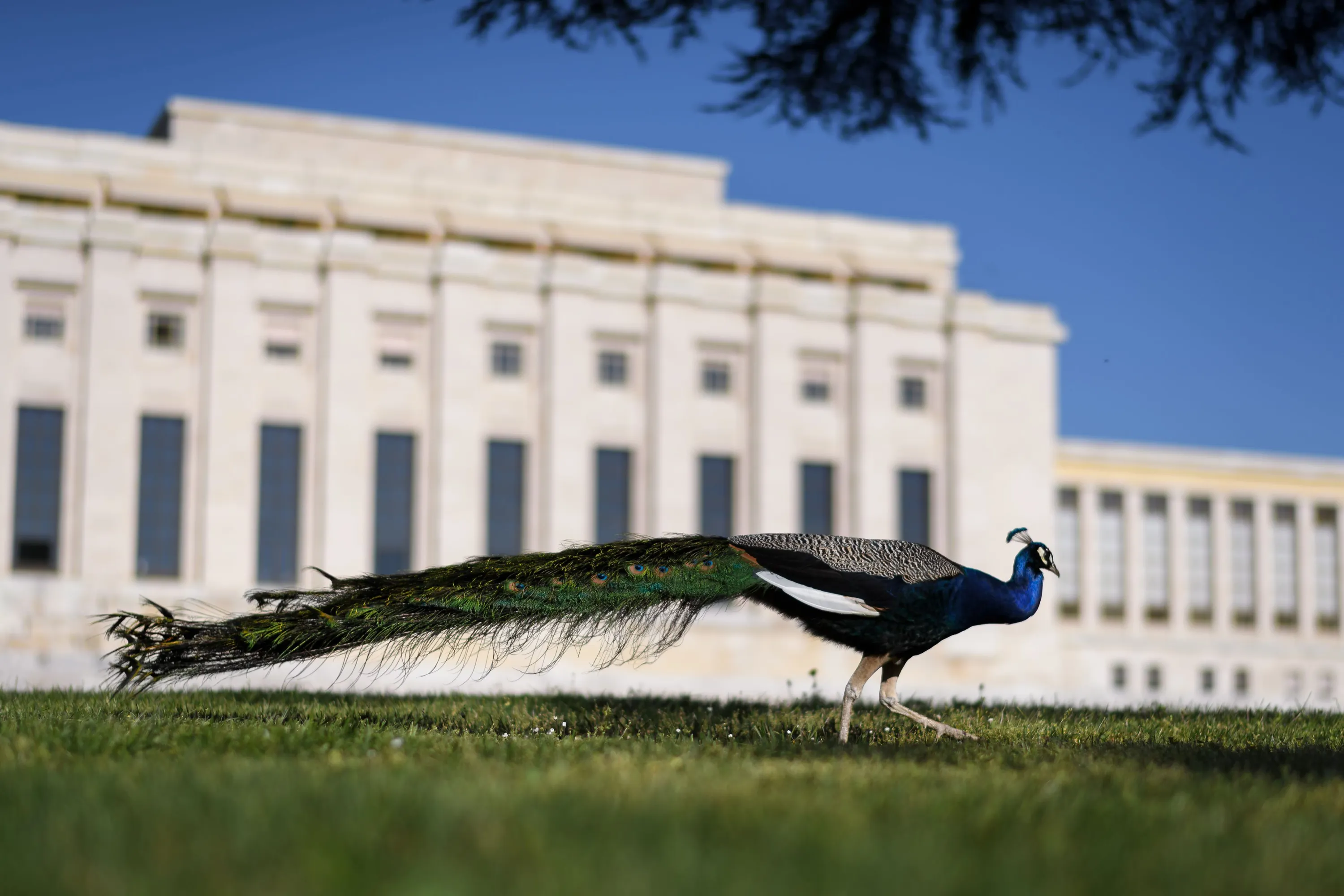 A photo taken on April 19, 2018 shows one of the famous peacocks of the United Nations Offices in Geneva making its way The peacocks are living in the 46- hectare Ariana Park surrounding the UN Offices and roaming freely on its grounds. (Photo by Fabrice Coffrini/AFP Photo)