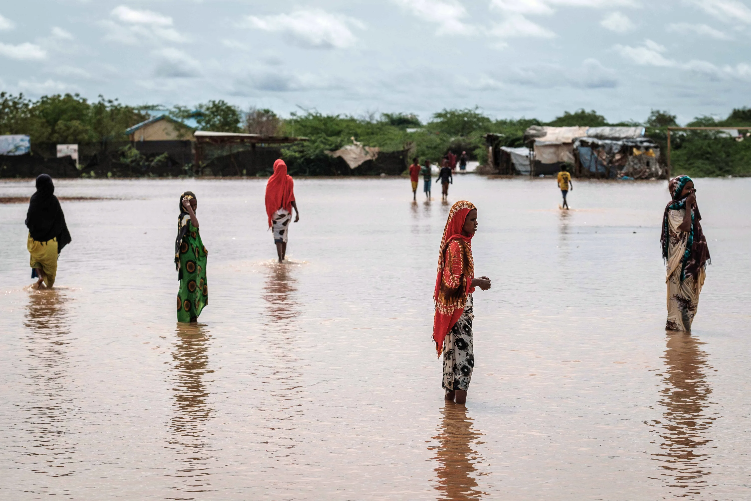 Refugees walk in floodwaters after a heavy rainy season downpour at the Dadaab refugee complex, in the north- east of Kenya, on April 17, 2018. The Dadaab refugee complex which has some 235269 refugees and asylum seekers in four camps about 80 kms from the Somali- Kenyan border was established in 1991, according to UNHCR camp population statistics in January 2018. (Photo by Yasuyoshi Chiba/AFP Photo)