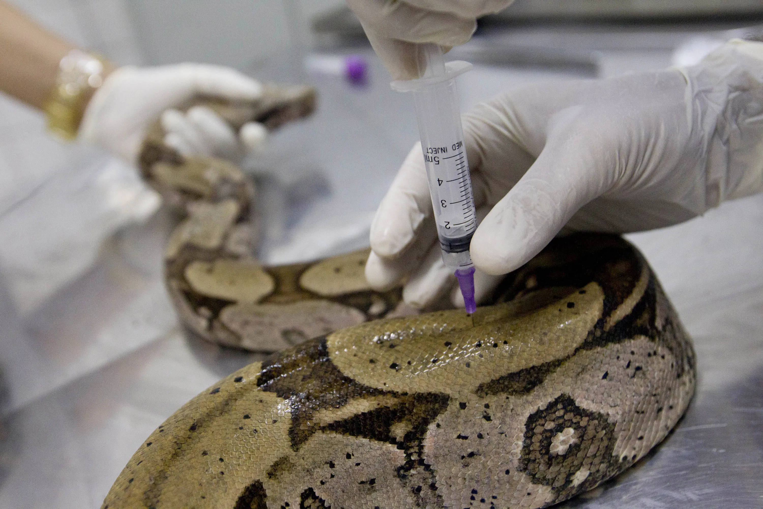 A Brazilian vet injects a vaccine in a Boa constrictor at the Sauim Castanheira Wildlife Refuge in Manaus, Brazil July 20, 2012. (Photo by Bruno Kelly/Reuters)