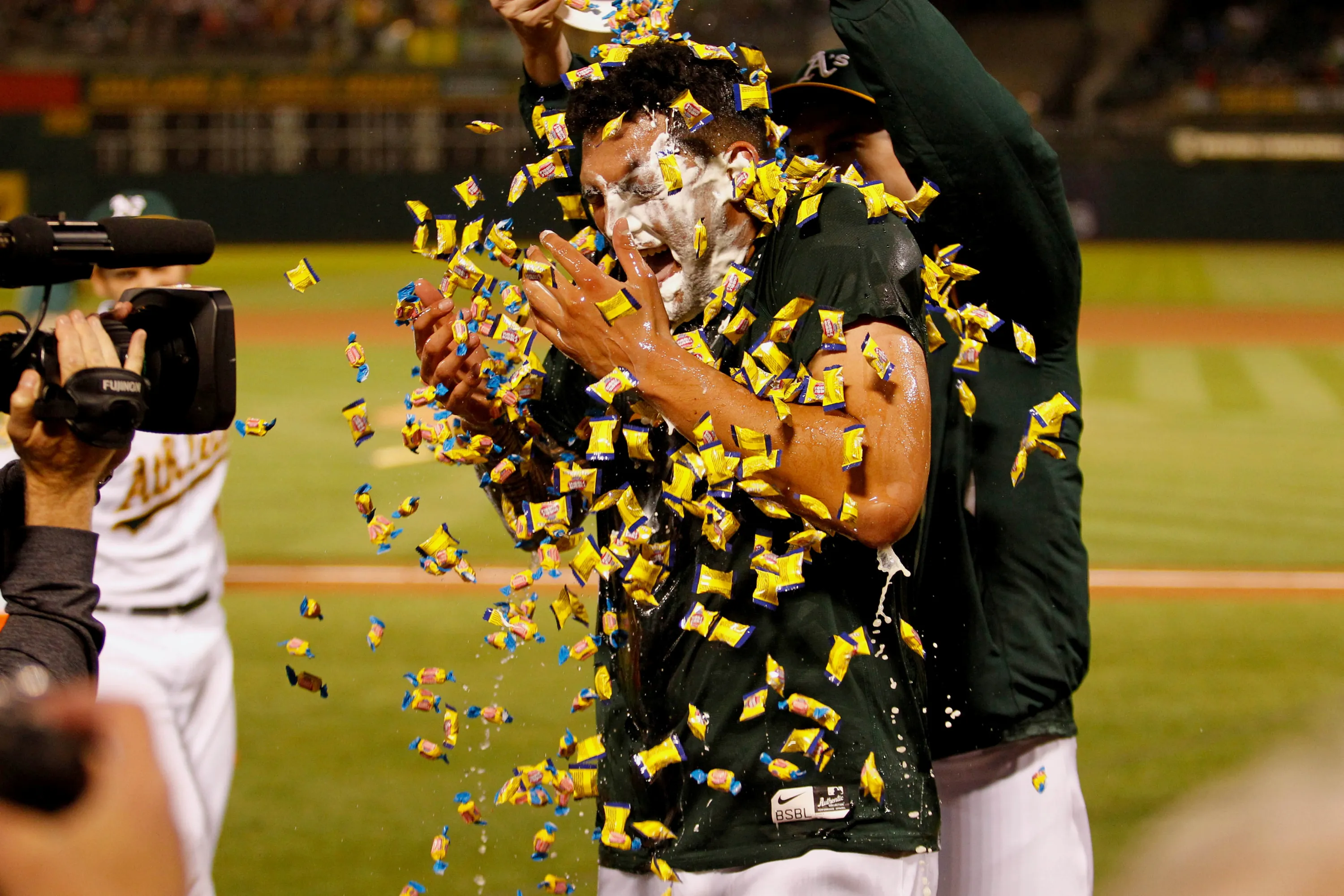 Oakland Athletics pitcher Sean Manaea (55) celebrates with teammates after throwing a no hitter against the Boston Red Sox at Oakland Coliseum in Oakland, CA, USA on April 21, 2018. (Photo by Kiel Maddox/Reuters/USA TODAY Sports)