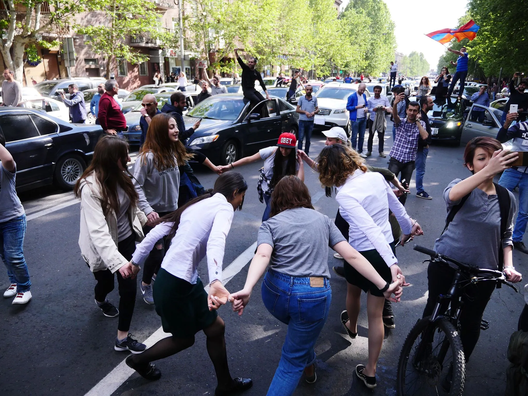 Women are dancing as they celebrate Armenian prime minister Serzh Sarkisian's resignation in downtown Yerevan on April 23, 2018 Armenia's veteran leader Serzh Sarkisian resigned on April 23, 2018 after mass protests against his election as prime minister, sparking jubilant celebrations across the impoverished country. (Photo by Amos Chapple/RFE/RL)