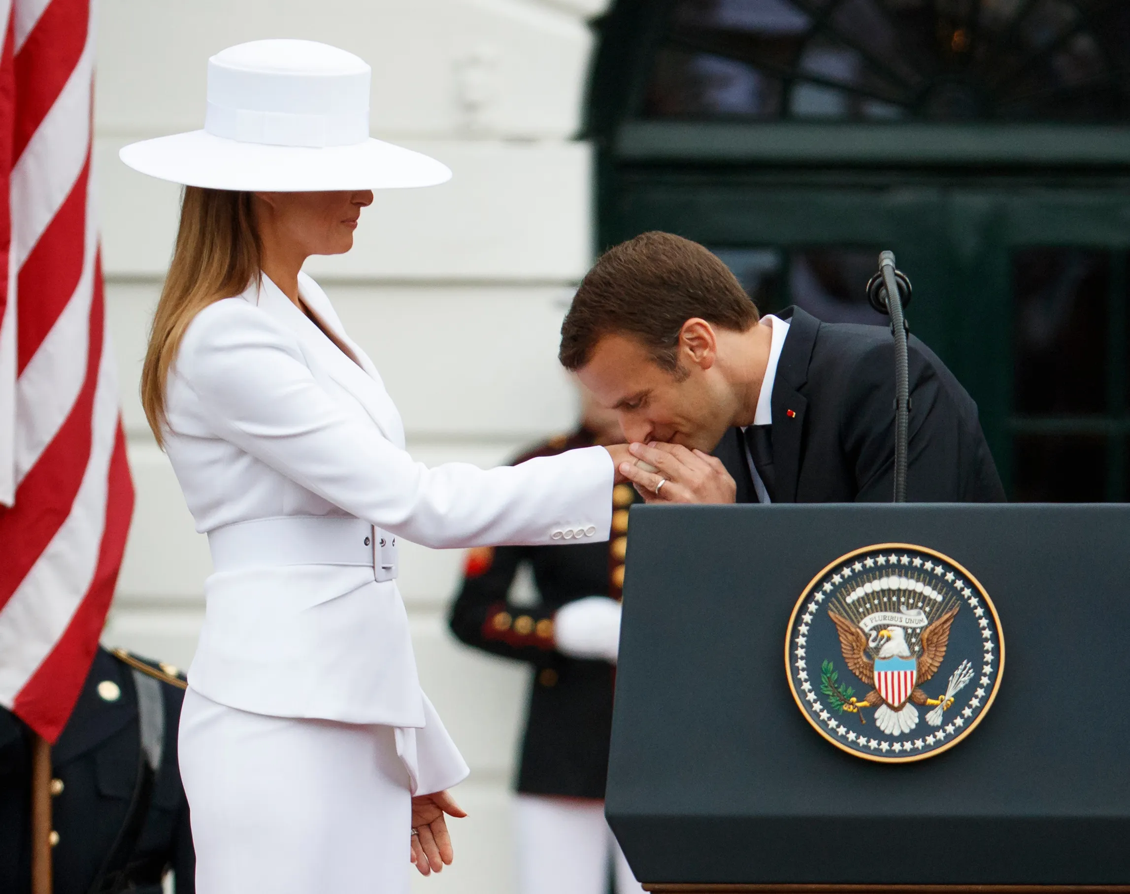 Brigitte Macron, left, and President Donald Trump, right, look on as French President Emmanuel Macron kisses the hand of first lady Melania Trump during a State Arrival Ceremony on the South Lawn of the White House, Tuesday, April 24, 2018, in Washington. (Photo by Evan Vucci/AP Photo)