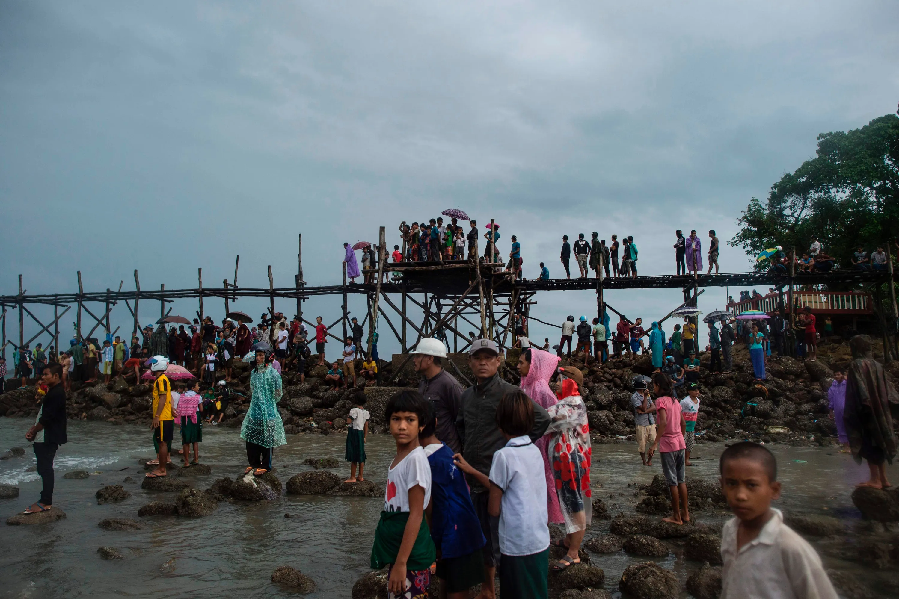 People watch Myanmar military members carrying dead bodies at Sanhlan village on June 8, 2017. Hundreds of people gathered solemnly on a beach in southern Myanmar awaiting news of their loved ones as rescuers worked to pull bodies from the Andaman Sea after a military plane crashed with more than 120 people on board. (Photo by Ye Aung Thu/AFP Photo)