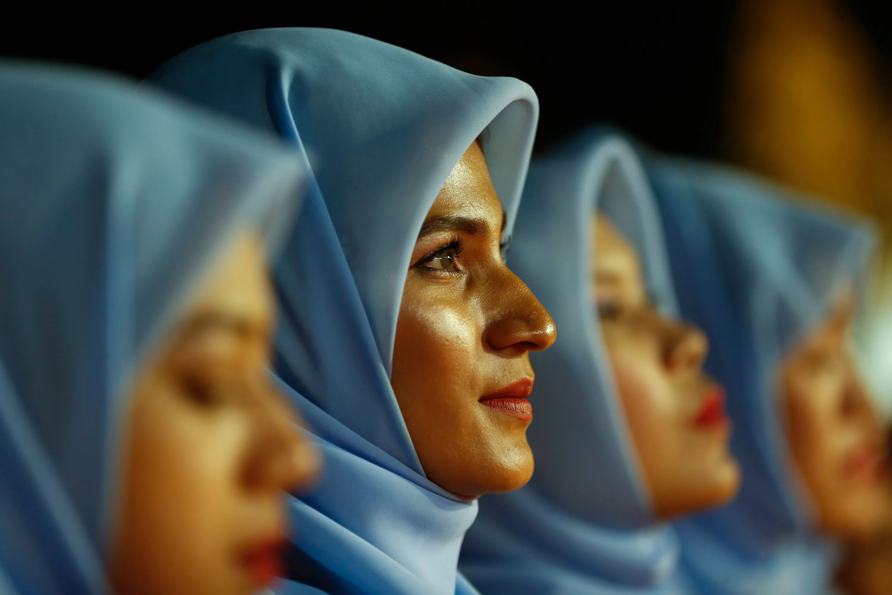 Muslim girls take part the Interreligious Gathering of Prayer for Peace ceremony in Yangon, Myanmar, 31 October 2017. Aung San Suu Kyi's National League for Democracy (NLD) party staged a demonstration of Interreligious Gathering of Prayer for Peace ceremony. (Photo by Lynn Bo Bo/EPA/EFE)