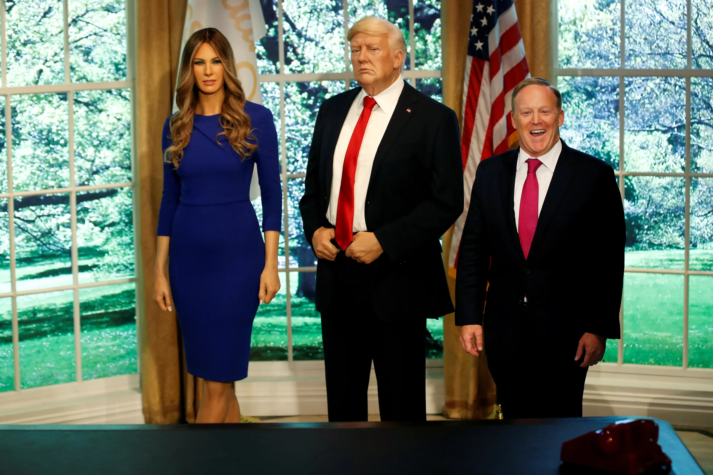 Former White House Press Secretary Sean Spicer poses next to a newly unveiled wax figure of first lady Melania Trump standing next to a wax figure of her husband, President Donald Trump, at the Madame Tussauds in New York, April 25, 2018. (Photo by Mike Segar/Reuters)