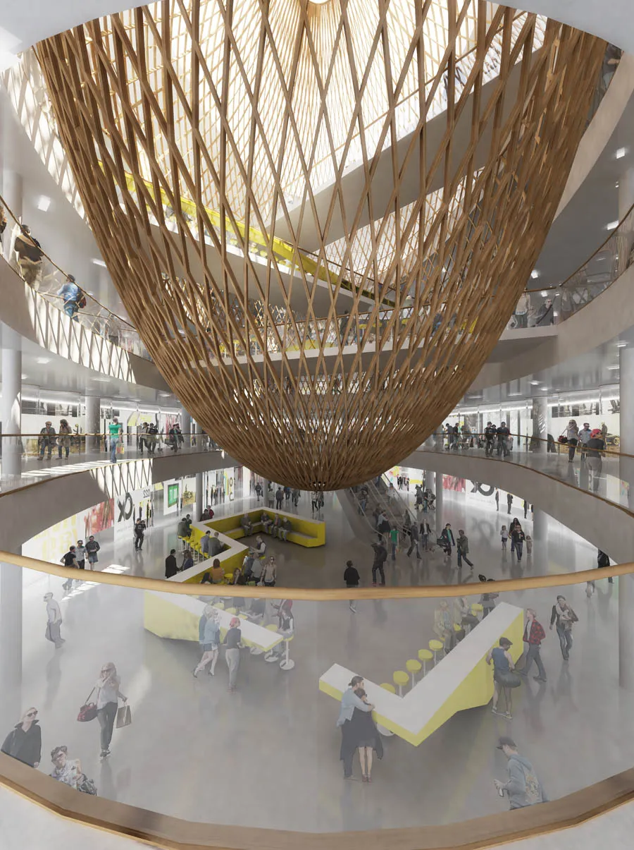 French architects Agence Search have won a competition to design a Paris shopping mall with proposals involving giant elliptical lattices. The five-storey-high, egg-shaped structures will define two atriums located at opposite ends of the shopping centre. Escalators and footbridges will pierce holes through the suspended structures. The architects drew inspiration for the project from the conceptual cenotaph that architect Étienne-Louis Boullée designed for scientist Isaac Newton over 200 years ago. Agence Search