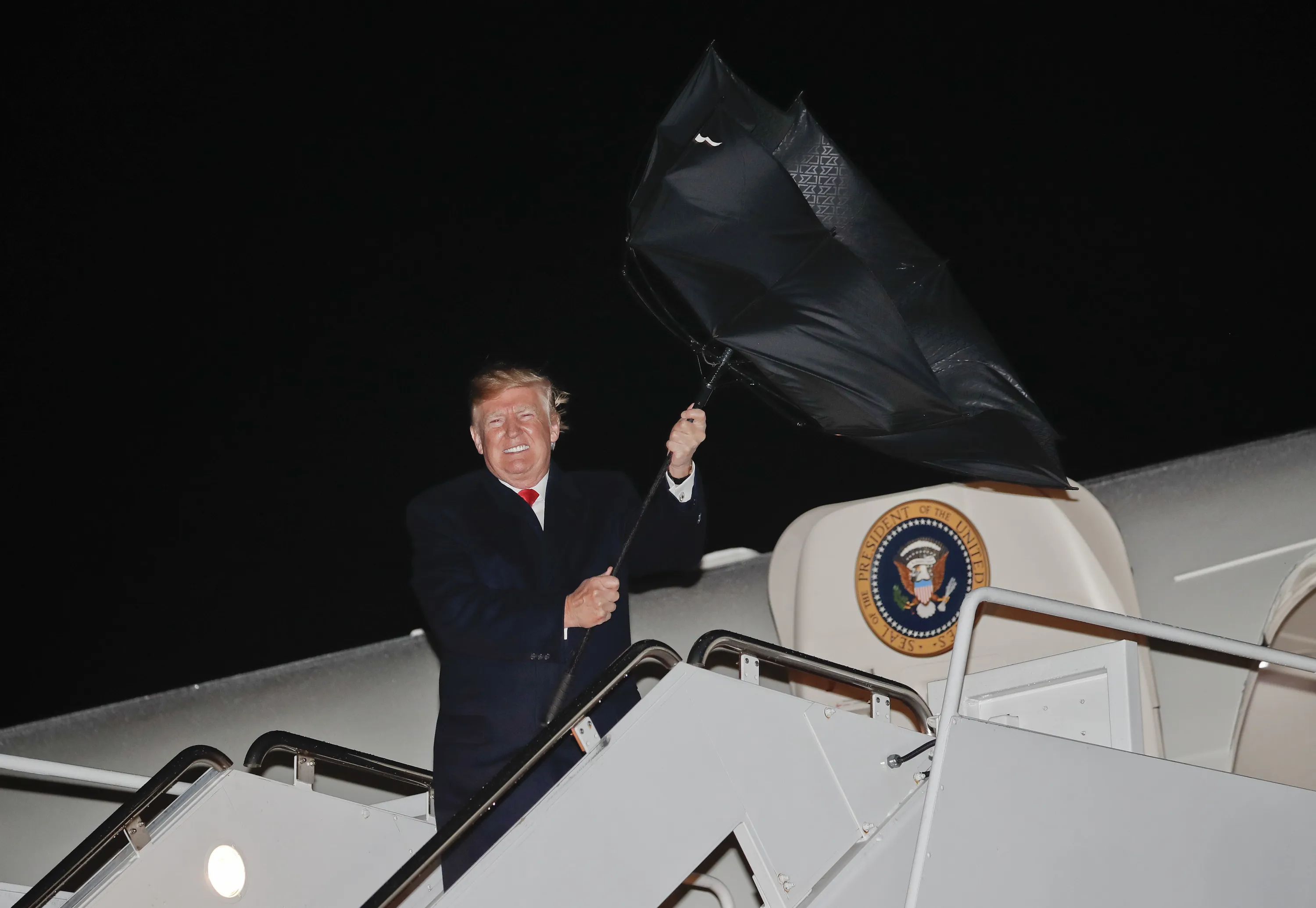 U.S. President Donald Trump's umbrella is turned inside out by a gust of wind while stepping off Air Force One during his arrival at Andrews Air Force Base, Md., Saturday, April 28, 2018. (Photo by Pablo Martinez Monsivais/AP Photo)