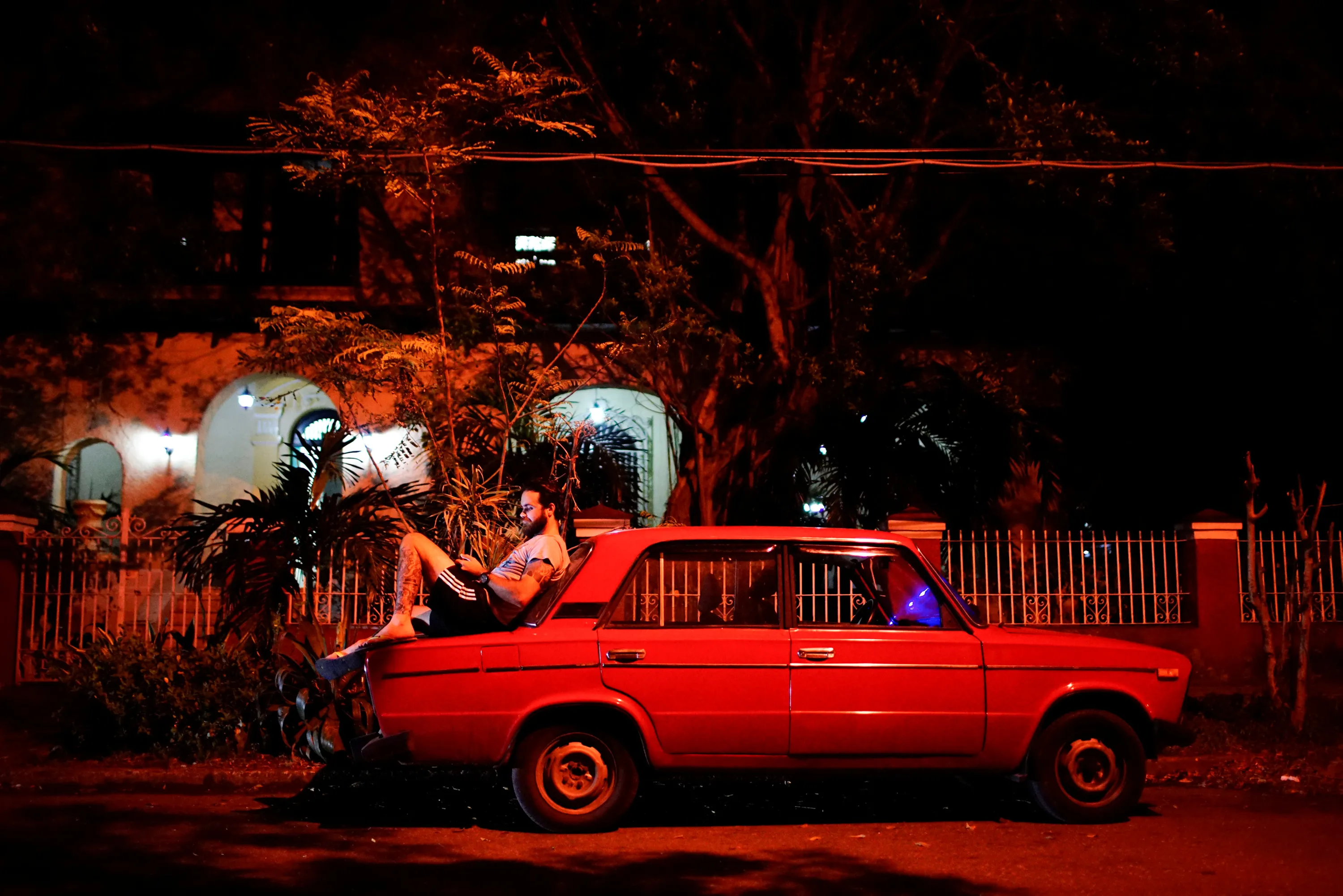Tourist guide Daniel Hernandez, 26, sits on his Russian-made car as he speaks to his girlfriend who lives in Britain, at an internet hotspot in Havana, Cuba, September 24, 2017. (Photo by Alexandre Meneghini/Reuters)