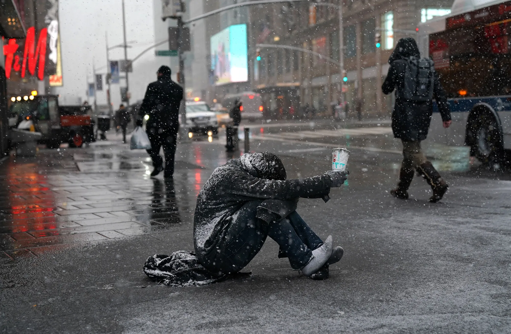 A man begs for money in the snow along 42nd Street in Times Square in New York on March 21, 2018, as the fourth nor'easter in a month hits the tri-state area on the first full day of spring. (Photo by Timothy A. Clary/AFP Photo)