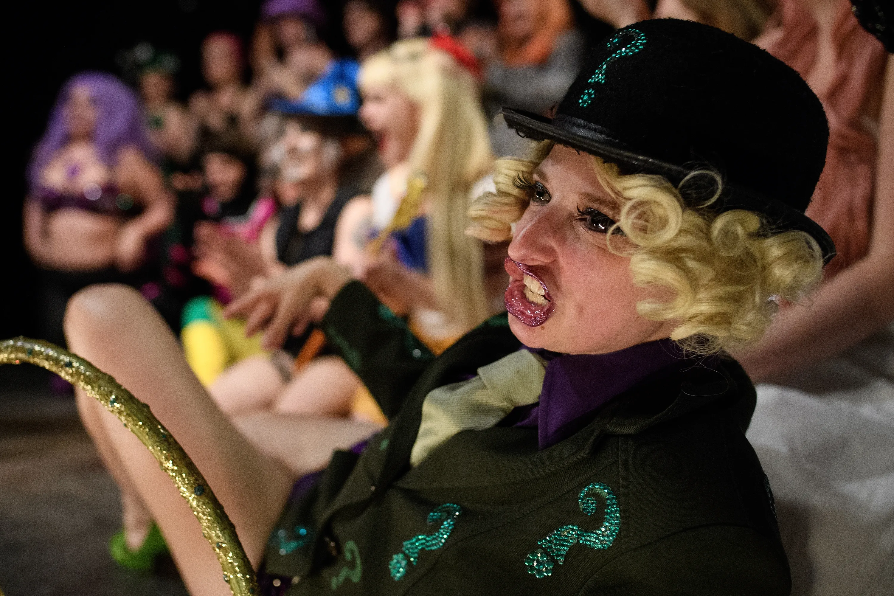 Burlesque dancer Lefty Lucy shouts to the audience during the finale of the opening night of the Nerdlesque Festival on April 27, 2018 in New York City. Dedicated to nerd and pop culture related burlesque, the three day event sees performers from across the world attend shows, classes and talks to promote the nerd burlesque culture. (Photo by Leon Neal/Getty Images)