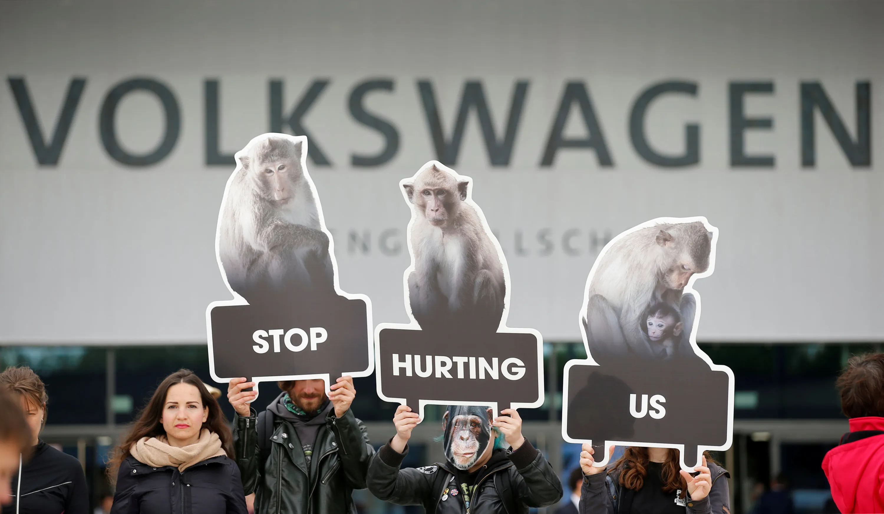 Activists from People for the Ethical Treatment of Animals (PETA) demonstrate during the Volkswagen Group's annual general meeting in Berlin, Germany, May 3, 2018. (Photo by Axel Schmidt/Reuters)