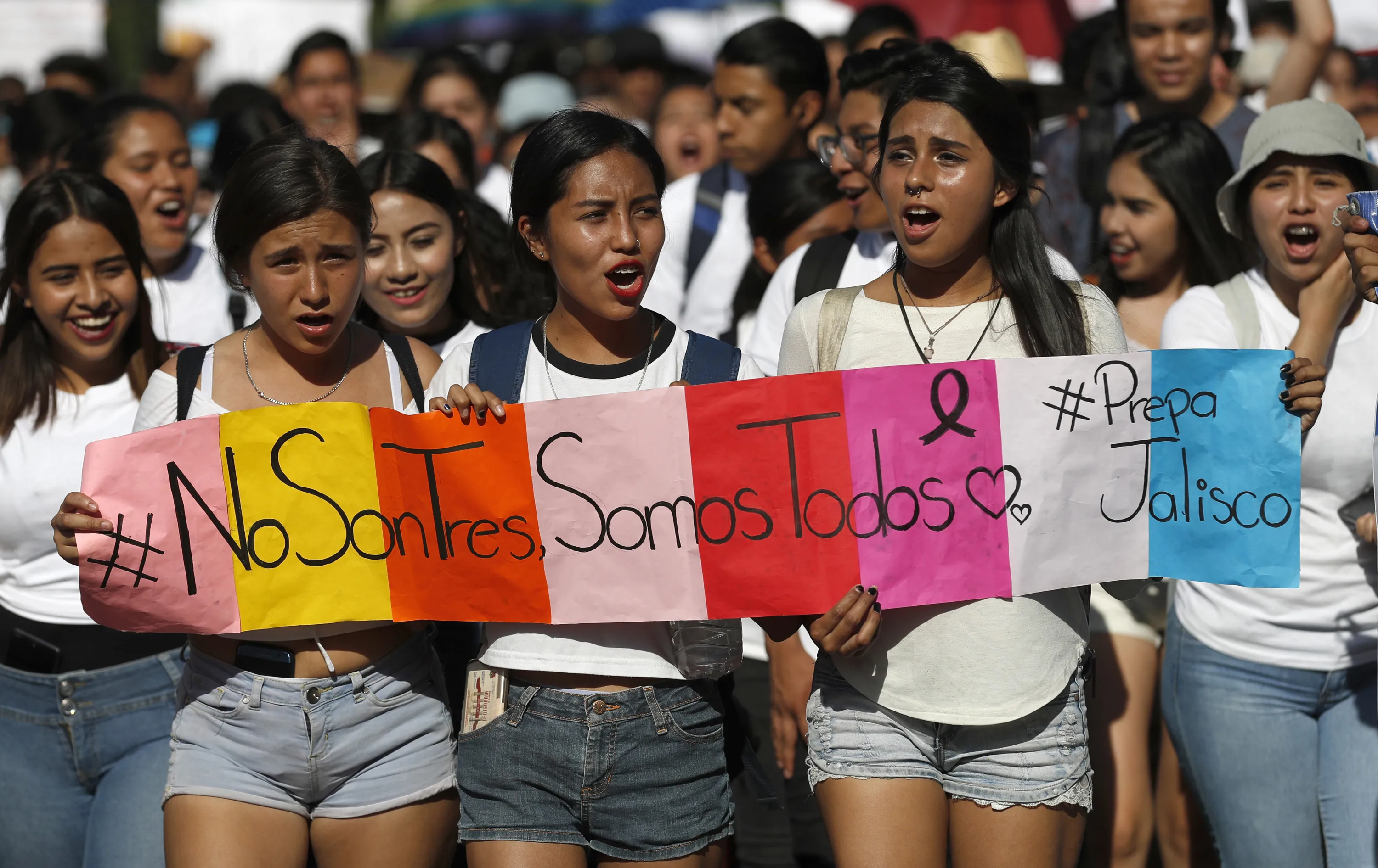 In this April 26, 2018 photo, students hold a sign that reads in Spanish “It's not three, it's all of us” during a protest against the murder of three film students who have become emblematic of Mexico's missing, in Guadalajara, Mexico. Prosecutors said the three were abducted by the Jalisco New Generation Cartel because they were filming a school project at a house used by the rival Nueva Plaza gang. The students were using the residence because it belonged to one of their aunts. (Photo by Eduardo Verdugo/AP Photo)